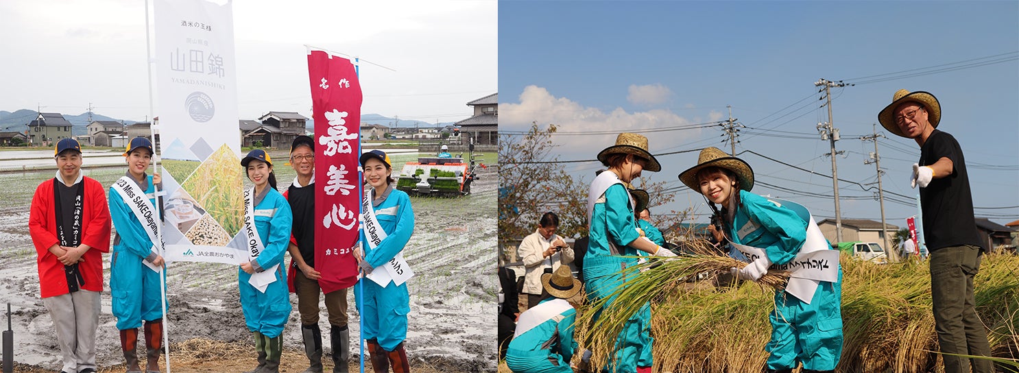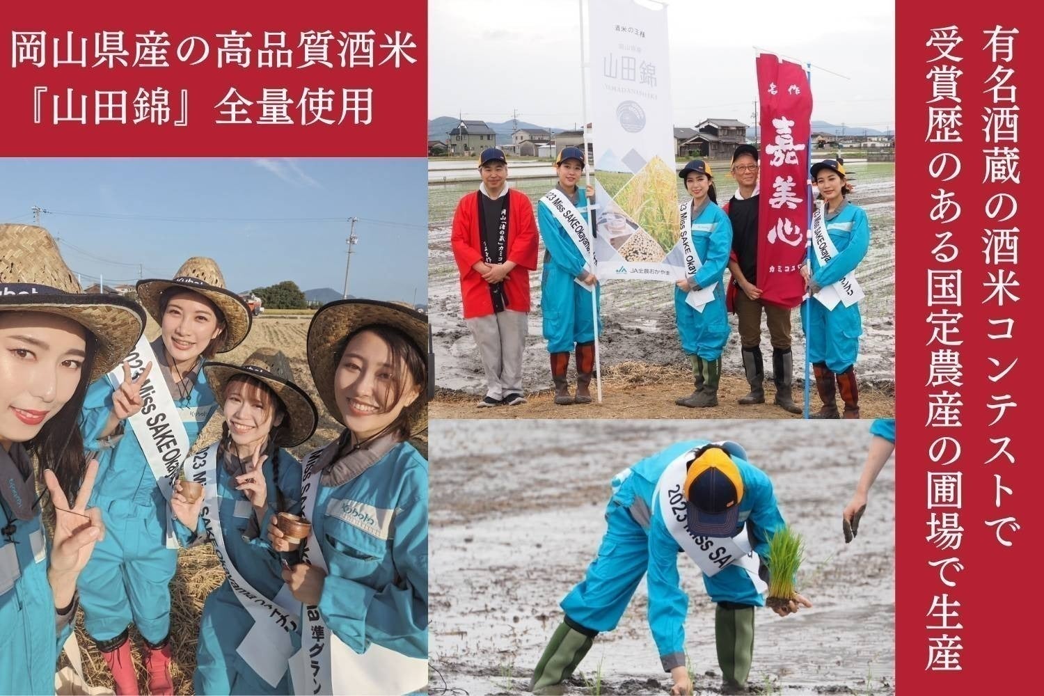 岡山市でこだわりのお米作りを行っている「国定農産」さんで、Miss SAKE 岡山メンバーと、嘉美心酒造の蔵人が一緒に「田植え」、「稲かり」を実施した酒造好適米「山田錦」を使い、Miss SAKE 岡山メンバーと一緒に商品企画、お酒造りまで行ったこだわりの日本酒をお届けします。