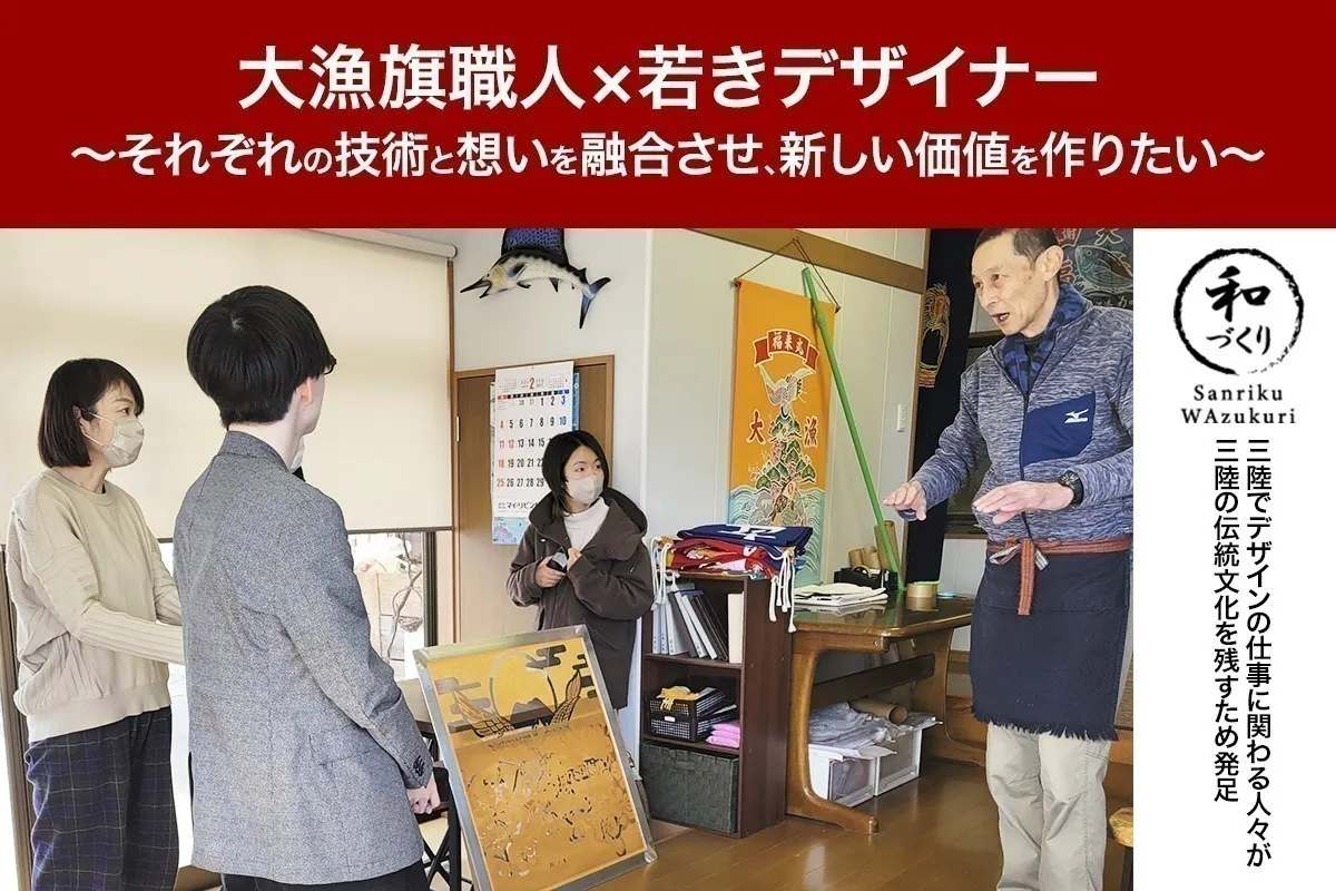 三陸地方では、このように伝統的な産業が、需要の減少と担い手不足により衰退の危機に瀕しています。地域の高齢化と若者の都市への流出、漁業の取れ高の縮小により、地方の漁業を支えてきた大漁旗という伝統産業の技術と知識が失われつつあります。そこで、このプロジェクトでは、伝統産業大漁旗の文化と技術を守り、次世代に継承していくために、南立三陸の職人と現地のデザイナーが協力し、伝統産業の需要創出とともに担い手を生み出し、そして現代社会に必要な商品開発をしていくことを目指します。