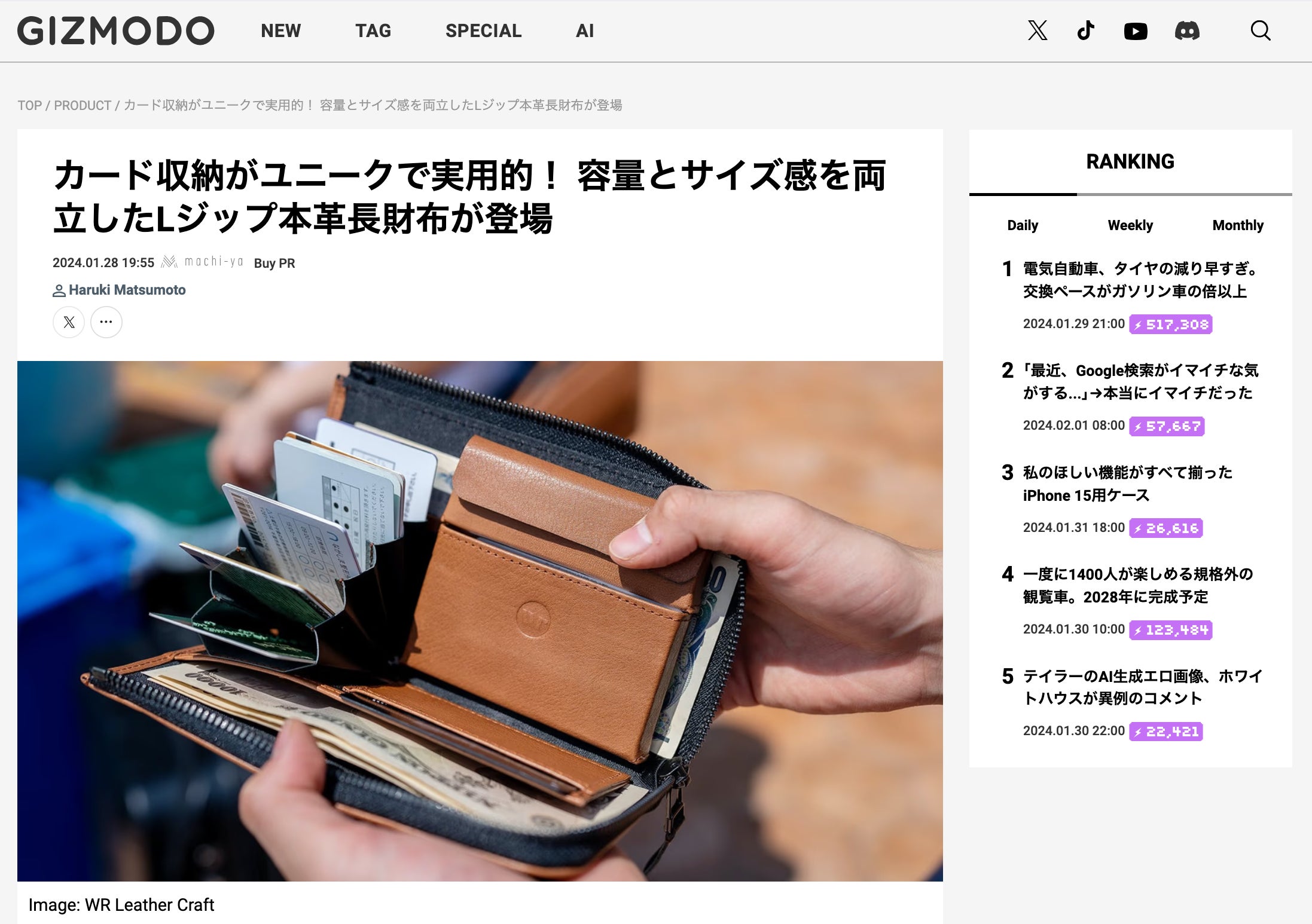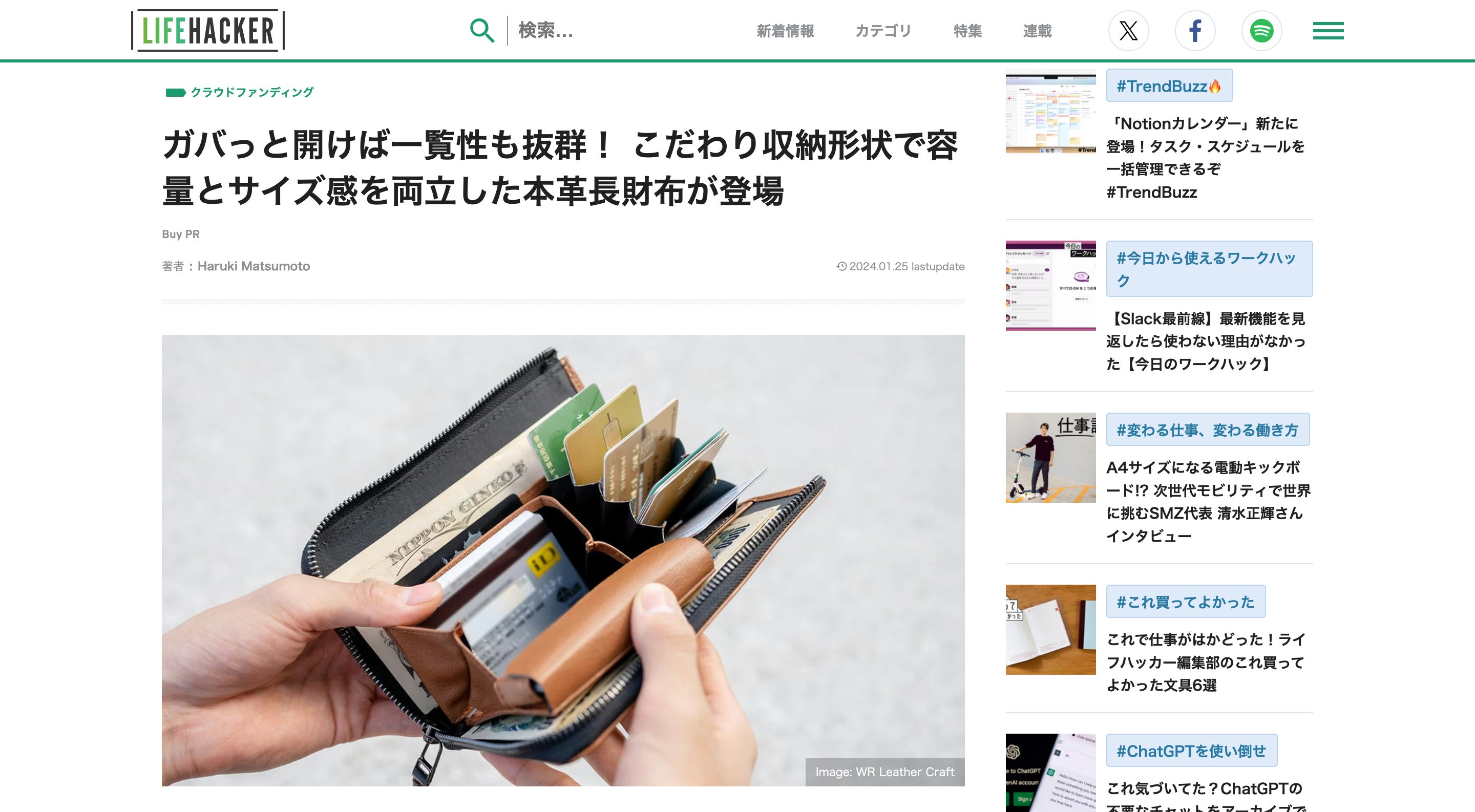 活動レポートをご覧いただきありがとう御座います。「扇形とボックス型ポケットが特徴!大容量で形崩れしにくい汎用性に富んだ本革長財布」実行者の㈱WR 西川です。残り1ヶ月を切った本プロジェクトですが、現在お陰さまで40名の方々よりご支援いただきました。これまでご支援いただきました皆さま、本当にありがとう御座います。さて、先日のことですが最新テクノロジーやデジタル社会に関連するニュースを扱うテクノロジーメディアサイト(Wikipediaより)”の【ギズモード・ジャパン】さんにこの長財布をご紹介いただきました。早速反響もありとっても嬉しい限りです!ご用意分にまだ残りがありますので、ぜひ周りの皆さまにも共有のお手伝いをお願いします!ギズモード・ジャパンさんのページはこちら