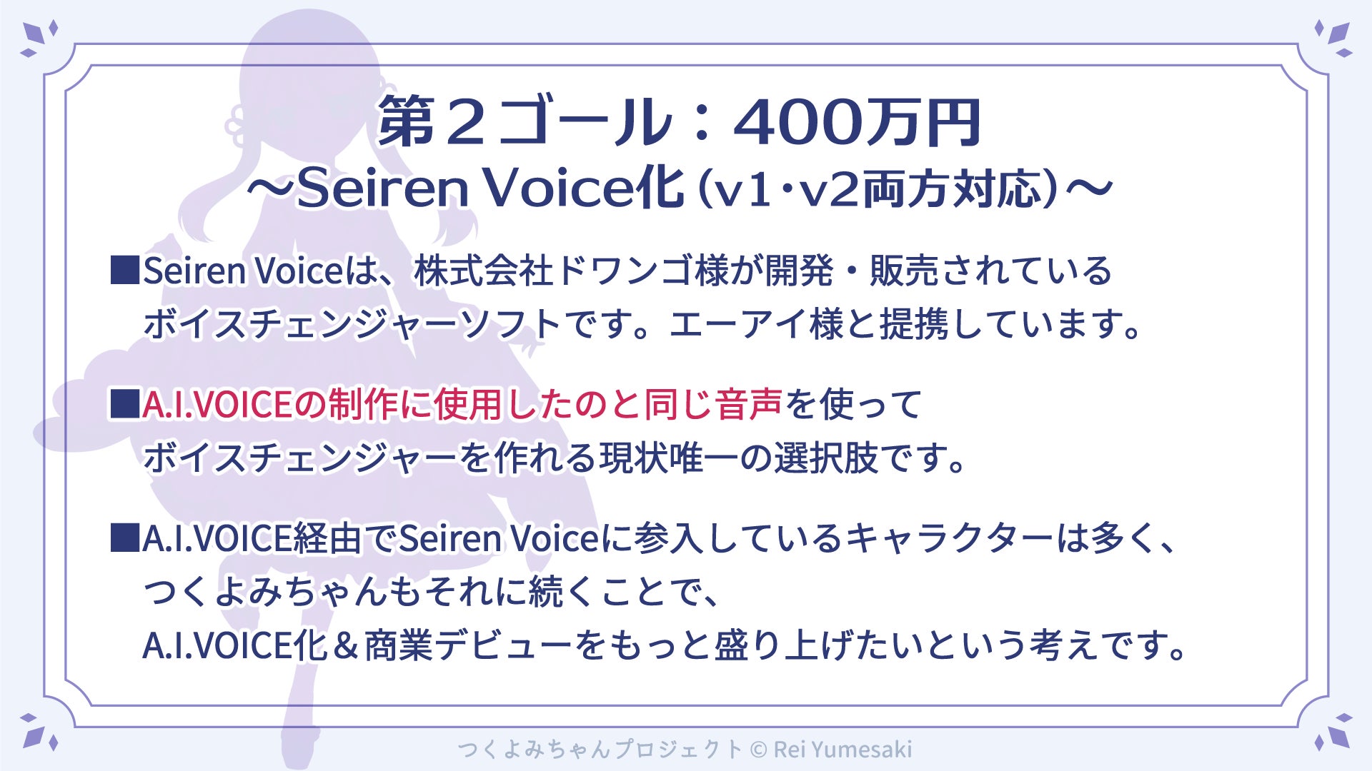おかげさまで、つくよみちゃんもSeiren Voiceになることができます。これはつくよみちゃんにとって、A.I.VOICEに続き2件目の商業ソフト化となります。