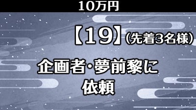 おかげさまで、「【19】企画者・夢前黎に依頼(先着3名様)」は売り切れとなりました。