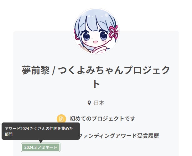 上記のページの更新日が2024/04/26とのことで、遅くともその時には受賞プロジェクトが発表されていたのですが、ページの存在に気づくのが遅くなってしまい申し訳ございません。「つくよみちゃんのA.I.VOICE化をもっと盛り上げるためのプロジェクト」を高く評価していただき、大変光栄に存じます。