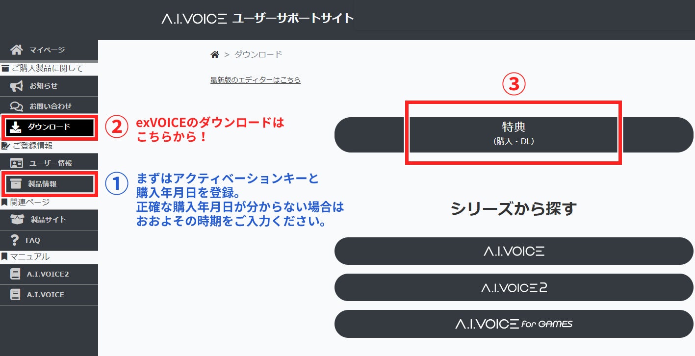 「A.I.VOICE ユーザーサポートサイト」でユーザー登録をし、「A.I.VOICE つくよみちゃん」または「A.I.VOICE2 つくよみちゃん」の製品情報を登録すると、ダウンロードできるようになります。