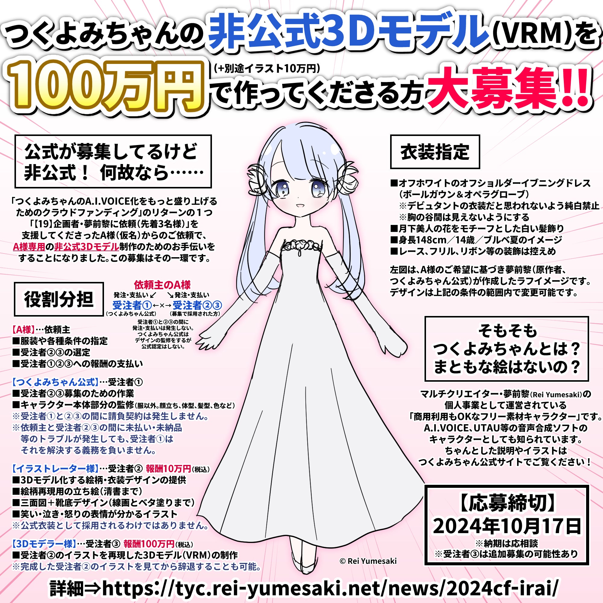 本日は、「つくよみちゃんの非公式3Dモデル(VRM)を100万円で作ってくださる方大募集!!」企画の開始をお知らせいたします。