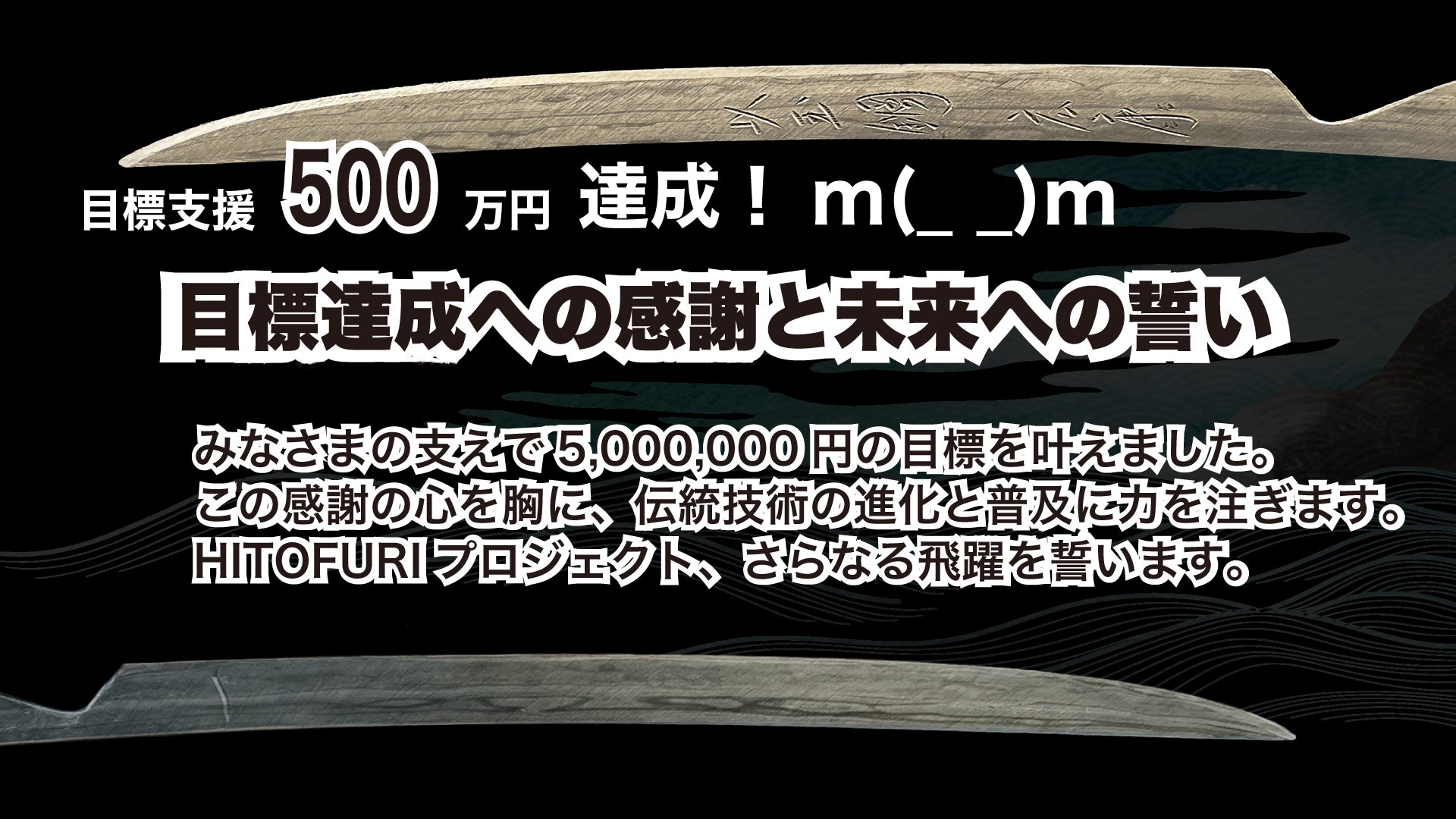 みなさまへ、この度は、HITOFURIプロジェクトが目標金額5,000,000円を超える支援をいただき、無事にクラウドファンディングの目標を達成できたことを心より伝えいたします。この大変光栄な成果を達成できたのは、一人ひとりのみなさまの温かなご支援と信頼の賜物です。私たちは、みなさまから寄せられたご支援に対して、深く謙虚な気持ちを持ち、今後も伝統技術の存続と発展に向けて、精進して参ります。このプロジェクトを通じて、私たちは日本の伝統技術が抱える多くの課題に直面しました。しかし、同時に、これらの技術が未来へと継承されることの重要性も改めて感じ取ることができました。私たちの活動は、ここからが真のスタートです。集まった資金は、以下の具体的な用途に向けて、大切に活用させていただきます。伝統技術の研究と開発新たな技術や素材の研究開発にも資金を投じ、伝統技術の新たな可能性を探ります。時代と共に進化する技術を取り入れることで、伝統技術が現代においても生き続けるための基盤を築きます。私たちがこれまで培ってきた技術に、新たなアイデアを融合させることで、伝統技術の新たな魅力を引き出す製品を開発します。これにより、より多くの方々に日本の伝統文化に触れていただける機会を提供したいと考えています。職人支援と技術保存伝統技術を守り、伝える職人たちとの協力も強化します。伝統の技術と知識の保存、及び後継者育成に必要な資源と、技術の継承をサポートします。伝統技術のマーケティング活動の強化新商品の魅力をより多くの方に知っていただくため、オンラインおよびオフラインでのマーケティング活動にも資金を充てます。特に、オンラインを活用したプロモーションや、国内外の展示会への参加など、幅広い活動を計画しています。私たちの活動と目標に対する変わらぬご支援とご理解を、心より感謝申し上げます。このプロジェクトの成功は、みなさまと共に築き上げた成果であり、私たちにとって新たな挑戦への原動力となります。これからも、伝統技術の魅力を広め、多くの方に愛される製品を提供できるよう努めて参ります。未来に向けて、日本の伝統技術の輝きを一層高めていくために、これからも努力を重ねて参ります。今後とも変わらぬご支援とご愛顧を賜りますよう、心からお願い申し上げます。この度は本当にご協力ありがとうございました。心より感謝を込めて、HITOFURIプロジェクトチーム一同