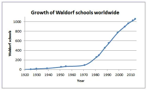 〈シュタイナー学校(ヴァルドルフ)認定校数の増加(1919年~2014年)〉