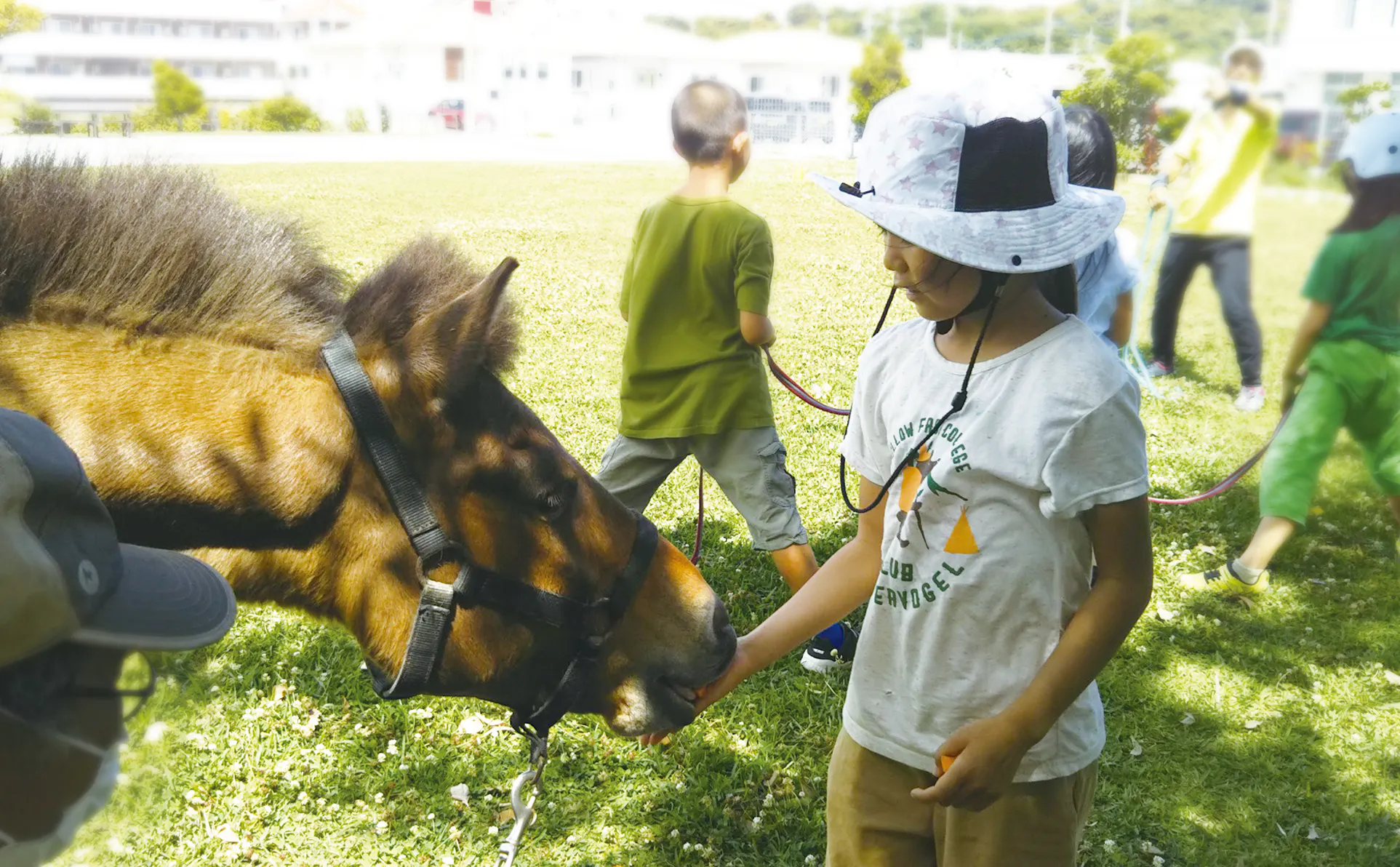 学園と提携した南城市のヨナグニウマ牧場で、3年生から2年間、体育の中で乗馬の授業があります。6・7年生になると、隔週一回、牧場の仕事を経験します。それらを通して、子どもたちの体や心を育みます。