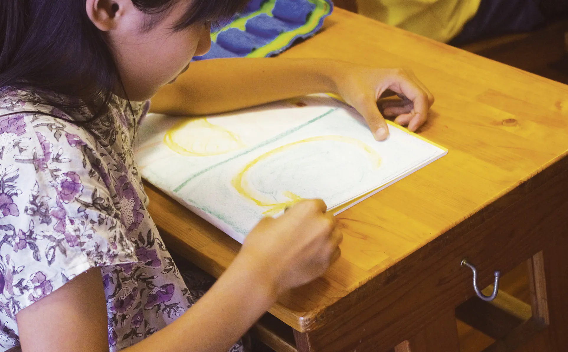 子どもたちは、教師が色とりどりのチョークで描いた黒板絵からイメージを受け取り、クレヨン(高学年は色鉛筆も)で授業内容をノートにまとめていきます。そのノートは、世界でたった一つの自分だけの教科書になります。