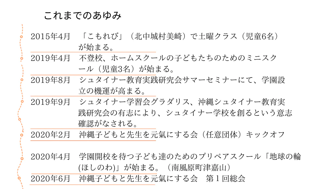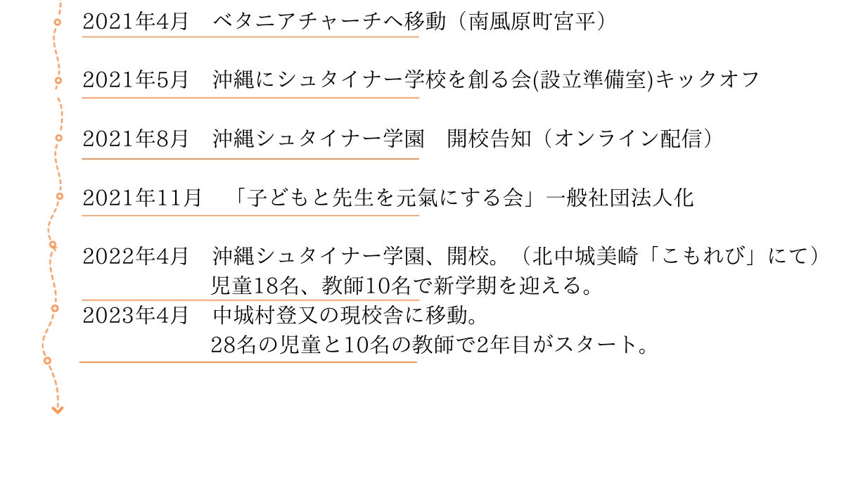 子どもの笑顔を守りたいと想う保護者と教師たちが、シュタイナー教育の下でつながり、子どもと先生を元氣にする会の発足、沖縄シュタイナー学園の開校にいたりました。