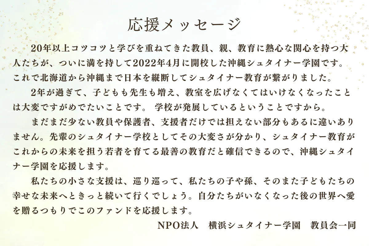 沖縄シュタイナー学園も、オルタナティブスクールであるため助成金を受けていません。運営費は、保護者の学費と寄付金だけでまかなっているため、保護者の負担はとても大きく、また、教師は低い賃金で働いています。