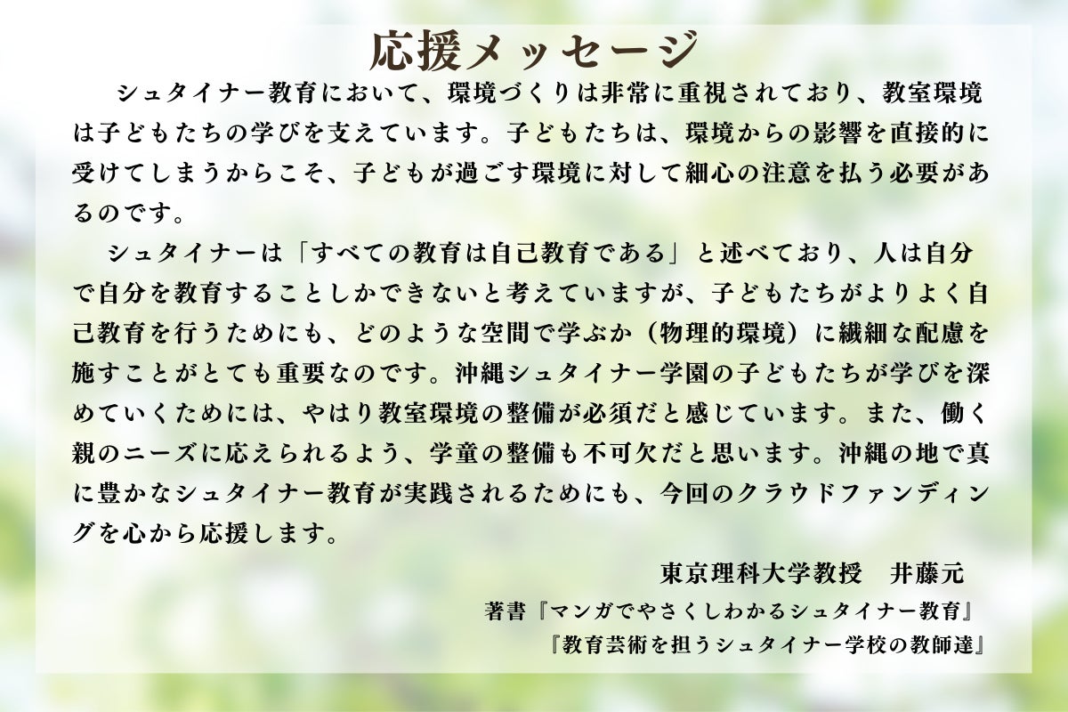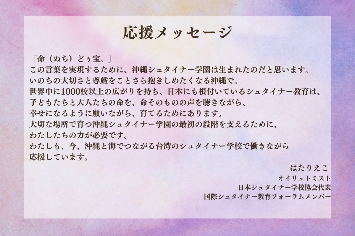 2022年4月、子どもと先生が生き生きと学ぶより良い社会の実現に向けて、ルドルフ・シュタイナーが提唱する教育理念を基盤にした沖縄シュタイナー学園を開校しました。学園の運営を継続させ、それをこの地に根づかせる事により沖縄の教育・地域・社会へ貢献していきたいと考え、多くの方々のご支援とご協力のもと、教師と保護者を中心に学園を運営しています。