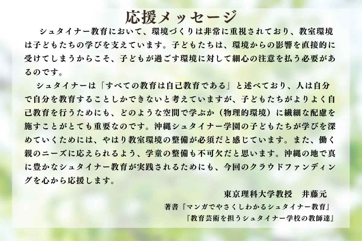 シュタイナー教育は、子どもの前に立つ教師をまず育てます。この教育の要は教師です。子どもと真剣に向き合い、9年間愛を持って育んでいく教師を新規雇用していきます。沖縄の文化を学ぶ、三線、空手等の講師も必要です。また、本物の体験を大切にするこの教育は、楽器や教具を一つ一つ選定し、創作していきます。