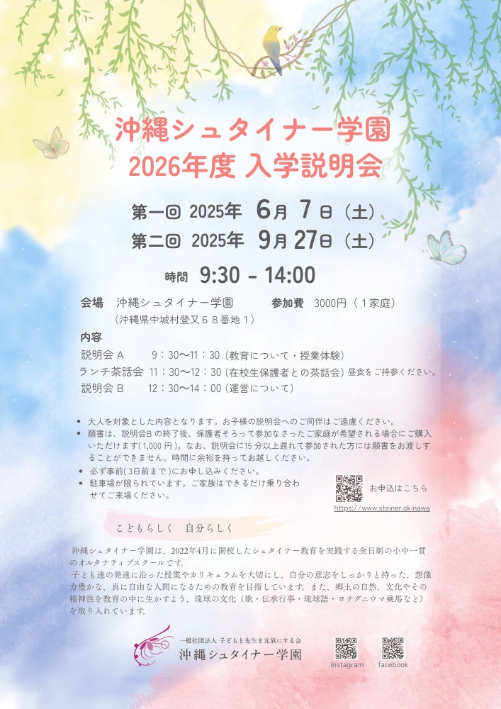 2025/09/22 19:00沖縄シュタイナー学園への新転入学を検討する方への2026年度入学説明会を開催します。詳しくは下記より募集要項をご確認の上、フォームよりお申し込みください。日時:2025年9月27日(土) 9:30〜14:00(受付 9:00〜9:25) 説明会 A 9:30~11:30 ランチ茶話会 11:30~12:30 説明会 B 12:30~14:00場所:沖縄シュタイナー学園(中城村登又68‐1)※要予約。お申込〆切は9月23日(火)の正午まで。〈詳細とお申込はこちらから〉https://www.steiner.okinawa/admission.html#guide5 もっと見る