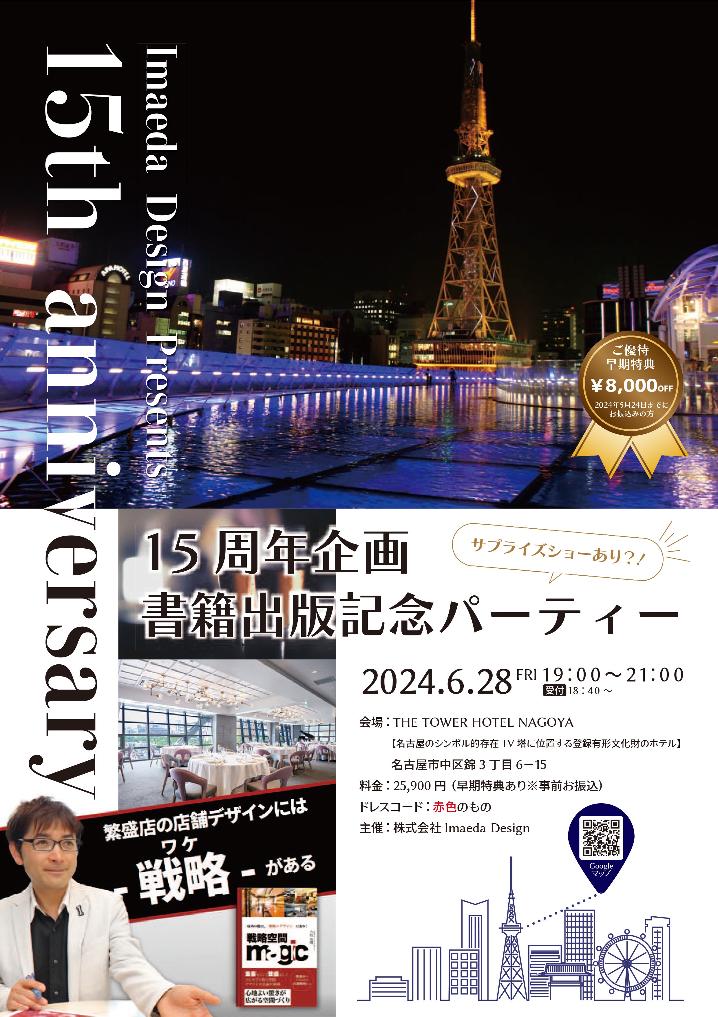2024/04/24 12:30ご支援いただき、ありがとうございます。クラウドファンディングで、「パーティーの申し込みを忘れた!!」って方のために。改めて、『15周年企画 書籍出版記念パーティ』のご案内をさせていただきます。早割期限(5/24)の1か月前になります。8,000円がお得になります!書籍出版記念パーティーでは、名古屋の夜景を一望できる素晴らしい空間でお時間を過ごしいただけるよう様々な催しをご用意しております。美味しいコース料理や飲み物、マジックショー、そして何よりも皆様との楽しい交流の時間をお楽しみいただけます。私たちは皆様とのつながりを大切にしており、今後も共に成長し、成功を築いていくことを願っています。これからの未来への希望と期待を共有する素晴らしい機会です。是非、『15周年企画 書籍出版記念パーティ』へのご参加をお待ちしております。日時:2024/6/28(金) 19:00~21:00場所:THE TOWER HOTEL NAGOYA料金:25,900円(※早期特典 ¥17,900 5/24まで限定)https://forms.gle/GVwWtistqrnnmi987経営者の方が沢山ご参加されますのでご紹介等もさせていただきます。ご参加いただきますことを、心よりお待ちしております。どうぞ宜しくお願いします。 もっと見る残り3時間になりました!!!!