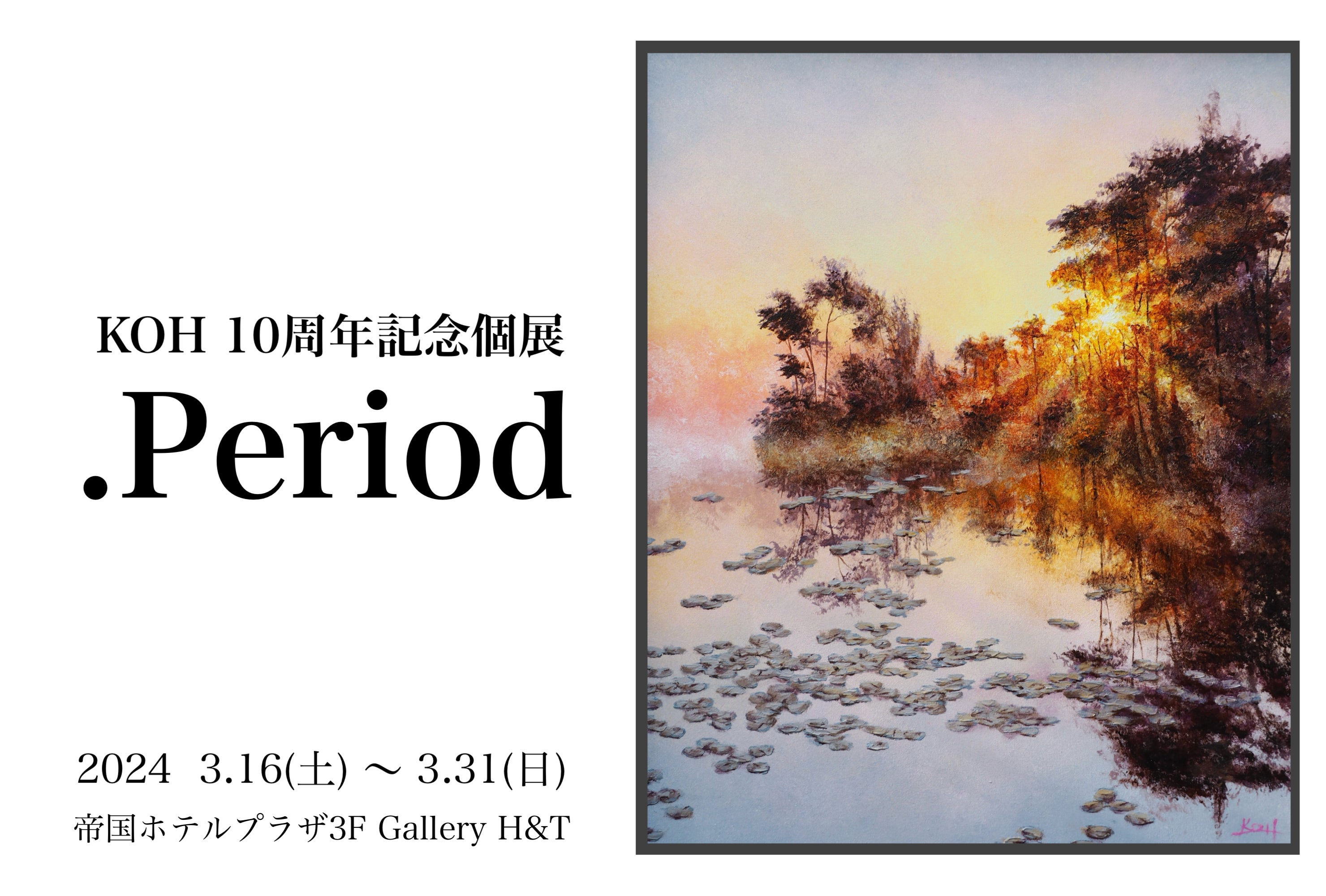 皆様お世話になっております。KOH 10周年記念個展 at関西 の会場、日程が正式に決定致しましたのでお知らせさせていただきます。会場は神戸 FLORE Artist Gallery日程は9月21日〜9月29日となります。前回の東京個展に引き続き10周年に相応しい作品達を揃えられたと思います。関西での個展は2019年ぶり2回目です。まだまだ関西での認知度は東京に比べかなり低いと思うので正直ドキドキですが1人でも多くの方にご来場いただけますと嬉しいです。更に、今回は東京個展から取り扱いを開始していただいたGallery H&T様と共同開催させていただく事となりました。当初の予定では会場の区画を半分程使う予定でしたがGallery H&T様のご協力のおかげで会場を全て貸し切っての開催と言うことになりました。もちろん、僕の作品の数は当初の予定以上に展示致しますのでお楽しみに!この大変ありがたいご縁をいただけたのも、前回の東京個展で良い結果が残せた事が大きく、まさしく皆様のおかげです。ありがとうございます。又、個展のDMデザインも完成致しましたのでCAMP FIREの活動報告に添付させていただきます。そちらもご確認下さい。DMが到着次第、直接送付もさせていただきます。よろしくお願い致します。以下詳細--------------------会場 : FLORE Artist Gallery日程 : 2024. 9/21 (土) - 9/29 (日)時間 : 10:30 - 18:30住所 : 神戸市中央区山本通1-7-9 ブーミン北野 1F