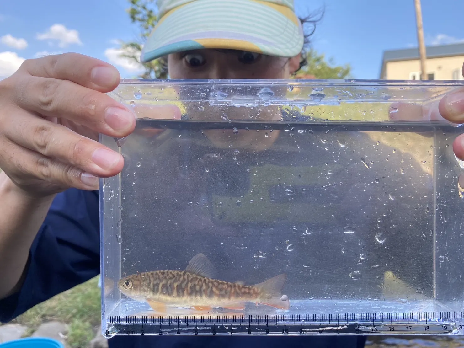 自然の川辺で、たも網をつかって、川底をガサガサ。