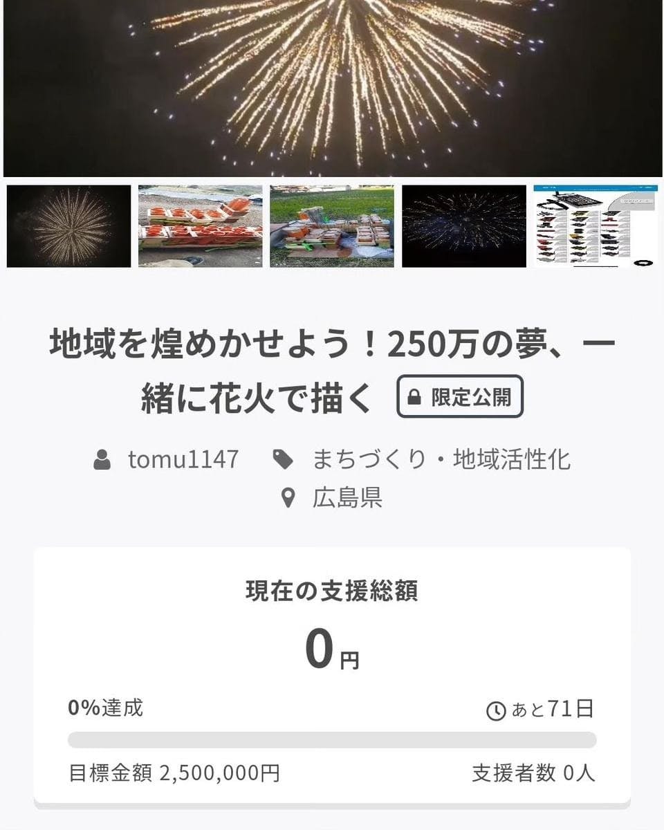 サポート方法:プロジェクトに参加: [https://camp-fire.jp/projects/view/727437?utm_source=line&utm_medium=social&utm_campaign=line_po_share_c_msg_fellow_recruitments_index]支援: 小額からでも大歓迎。地域の花火を支えませんか?地域活性化へのご協力:吉田の美しい空に花火を咲かせましょう!地域のみなさん、どうぞお力を貸してください。達成させるために:皆様のご支援があれば、地域活性化と素晴らしい花火イベントの成功が約束されています! 心より感謝:これまでのご支援に心から感謝いたします。皆様と一緒に夢を実現させたい!
