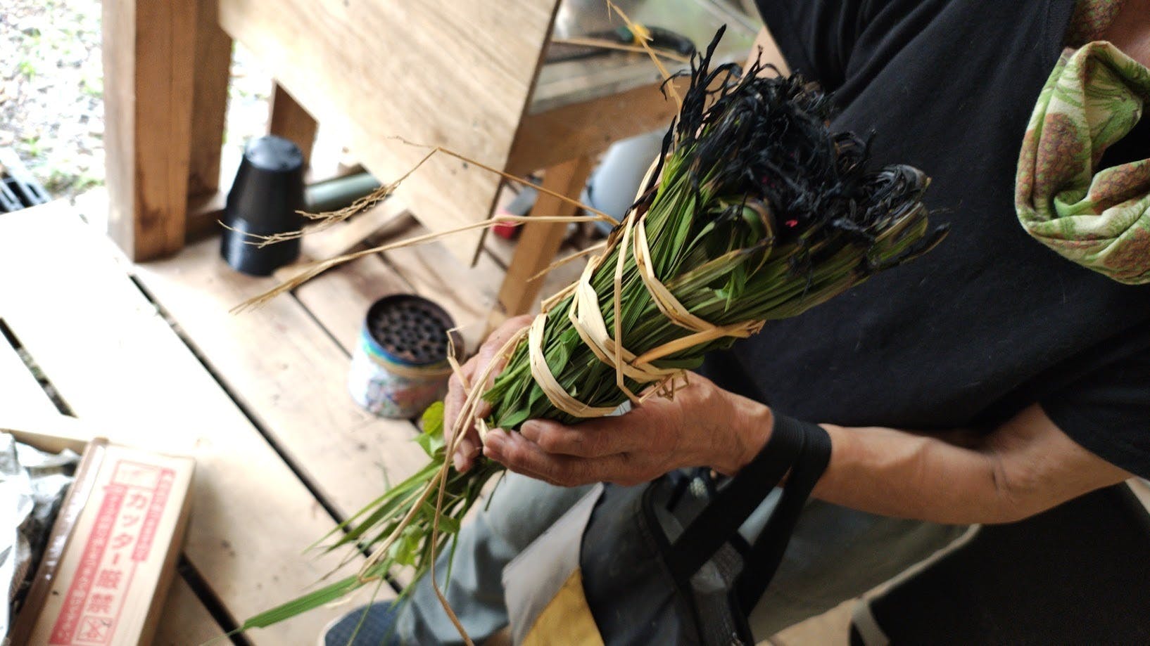 カヤの葉っぱを束ねてきつく巻き付けた束