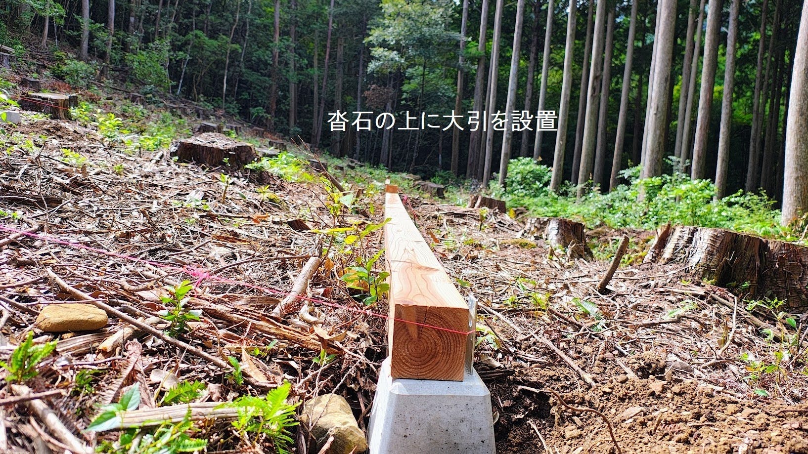 3寸角の木材を置き、大引として使用するため仮設置。