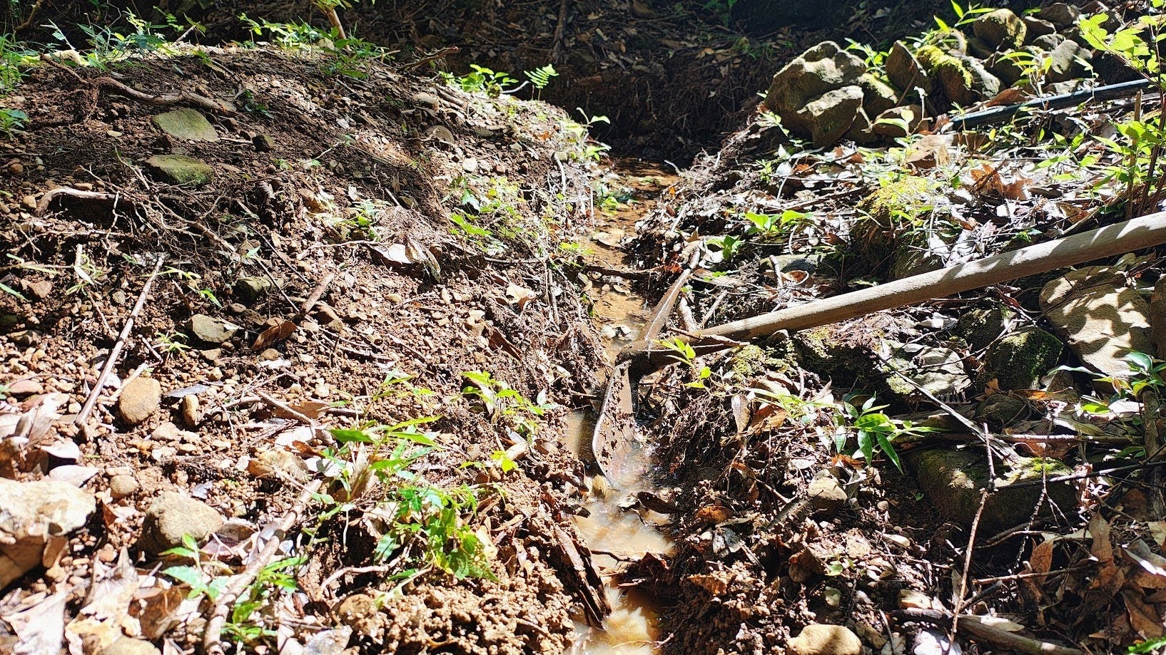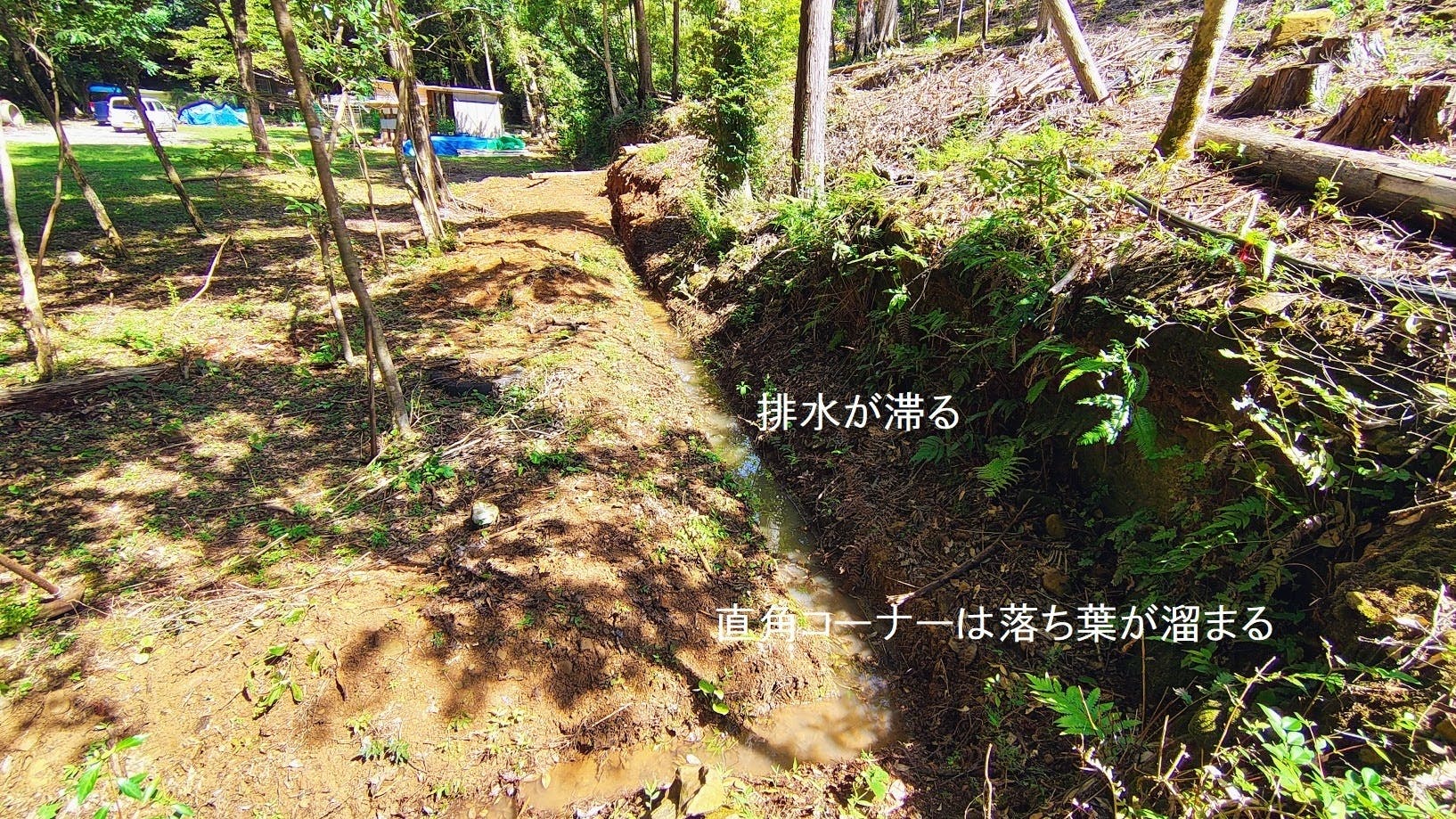 開拓地裏山から流れた水と落ち葉が排水溝に一杯溜まって、