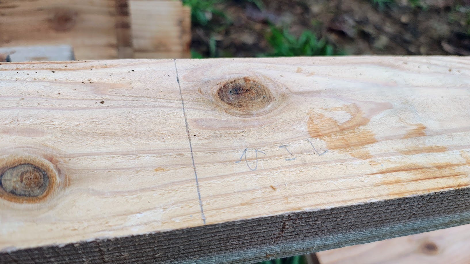 鶏舎の屋根のひさしとなる箇所に「しるし」をうっていきます。