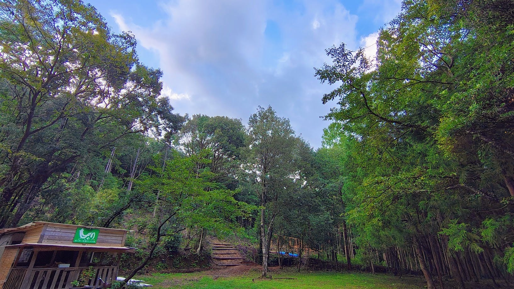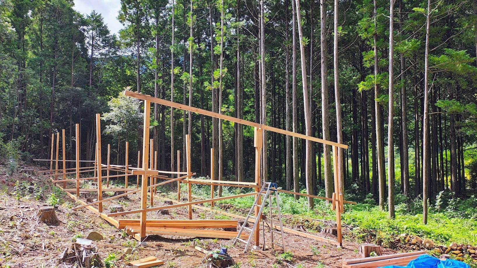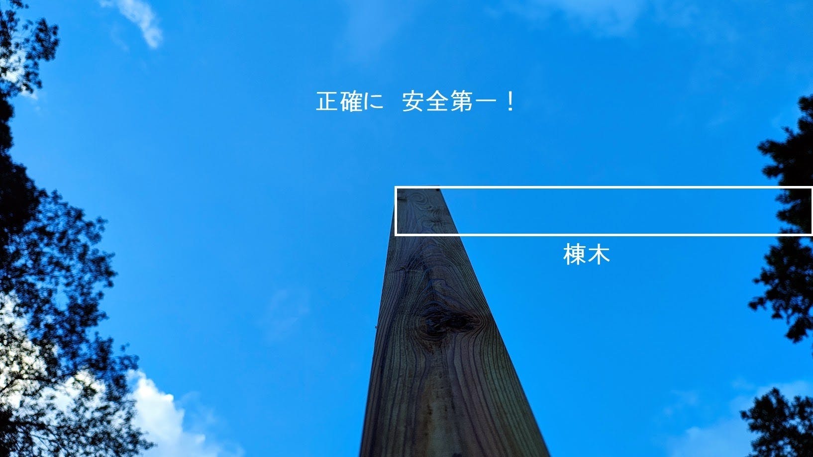 棟上げの作業は、不安定な山の斜面に脚立を立てて