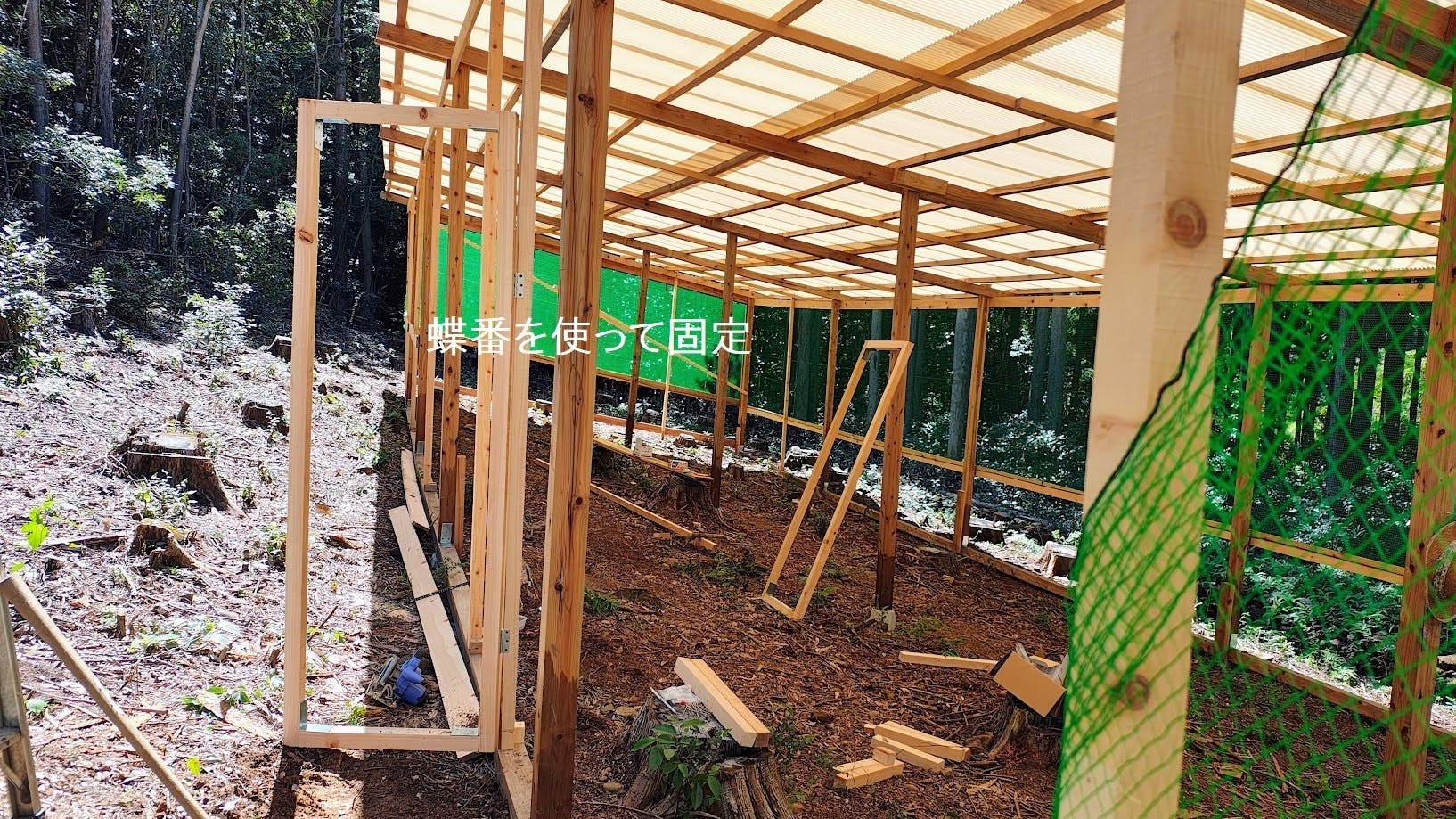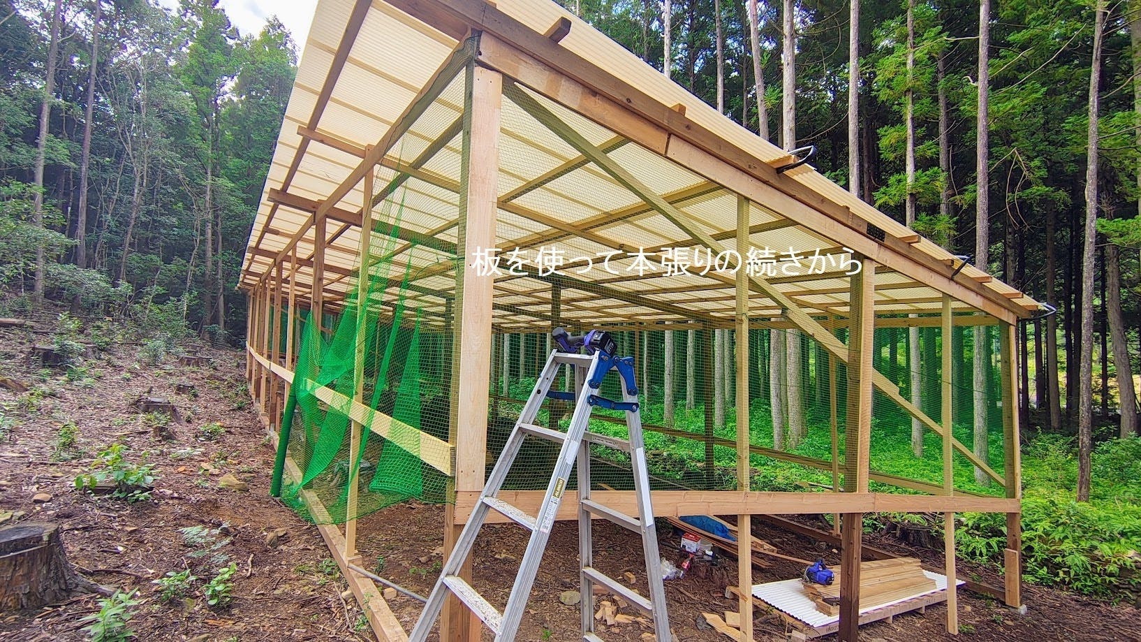 防鳥ネットの板を使って本張りの続きから始め、