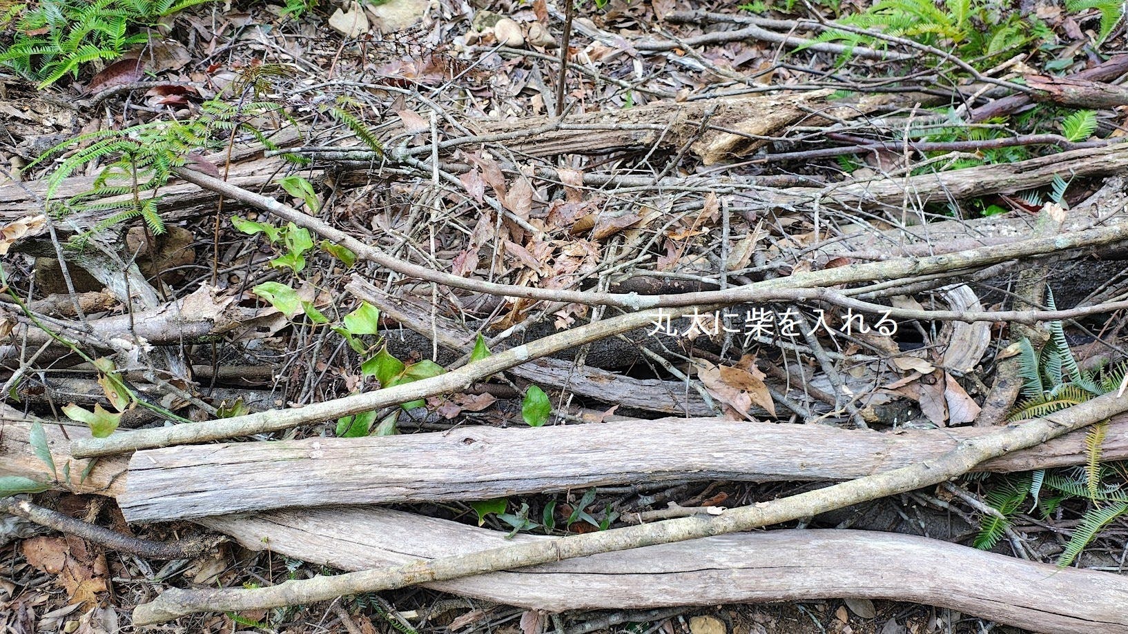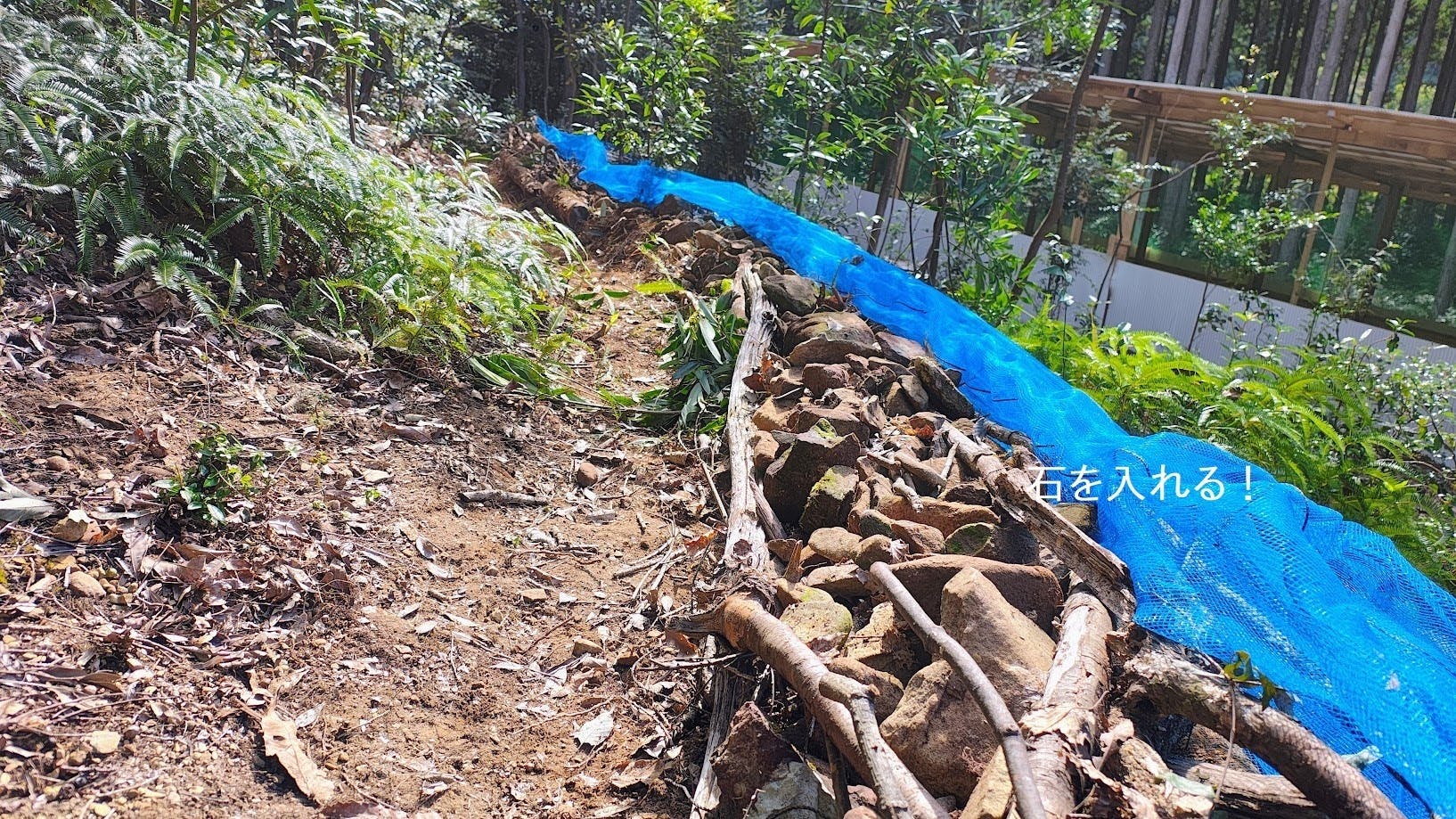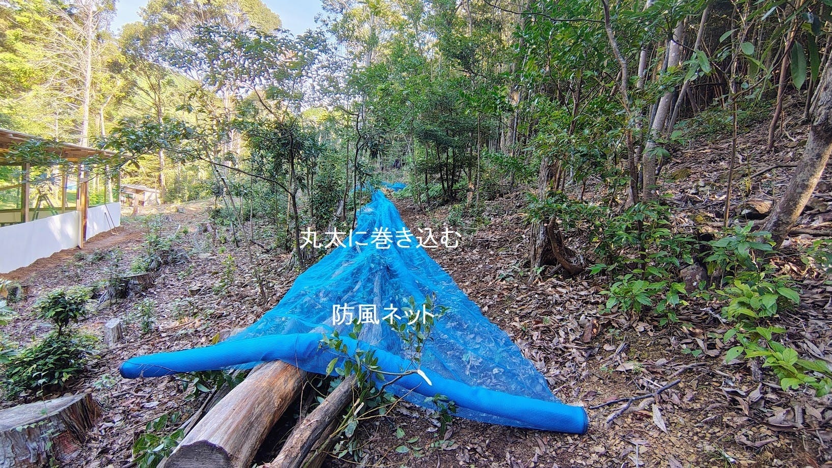 敷設した丸太の中に柴を入れ、防風ネットを巻き込みます。