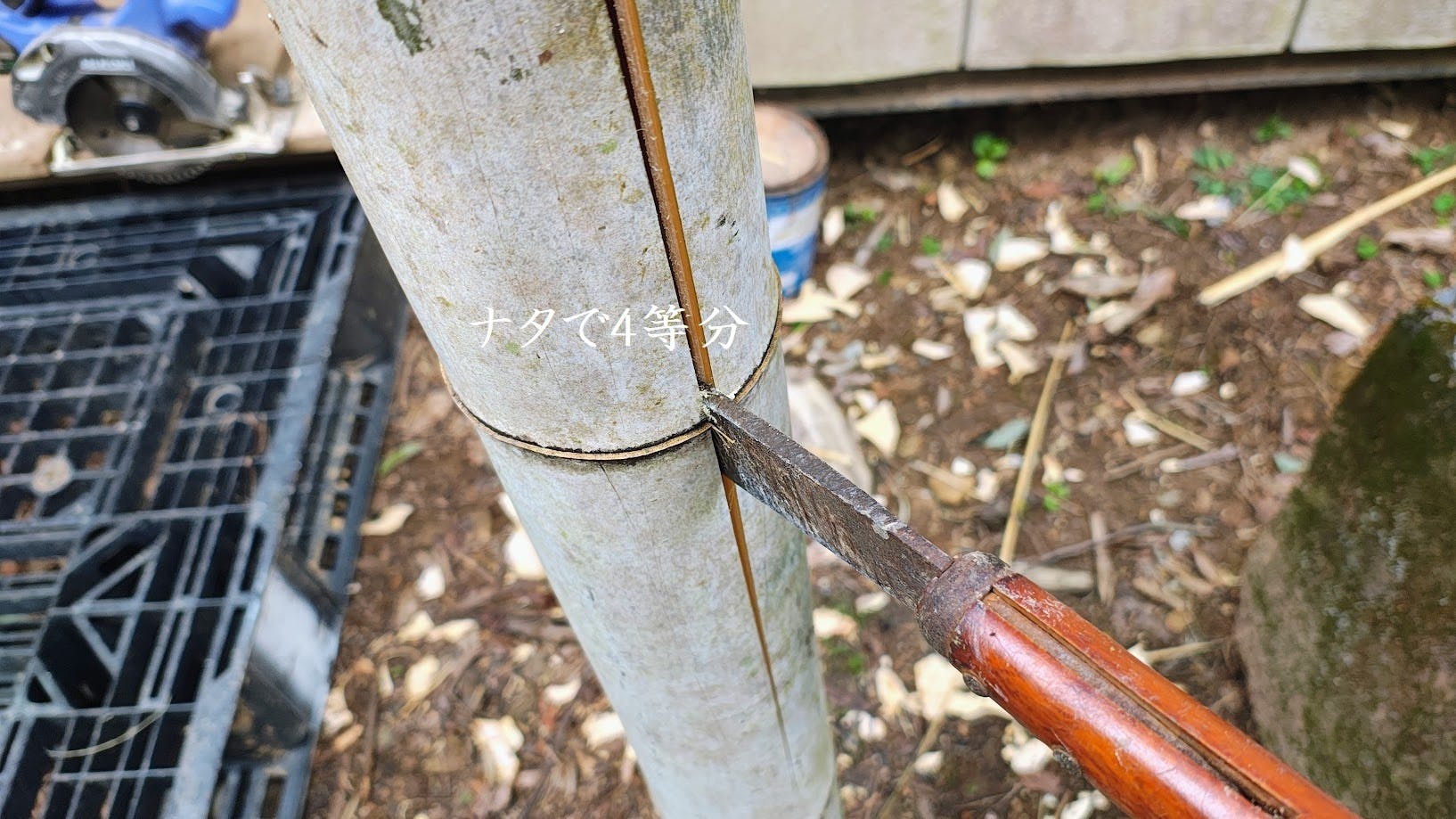 適当な長さにカットした後、ナタを使って4等分にしていきます
