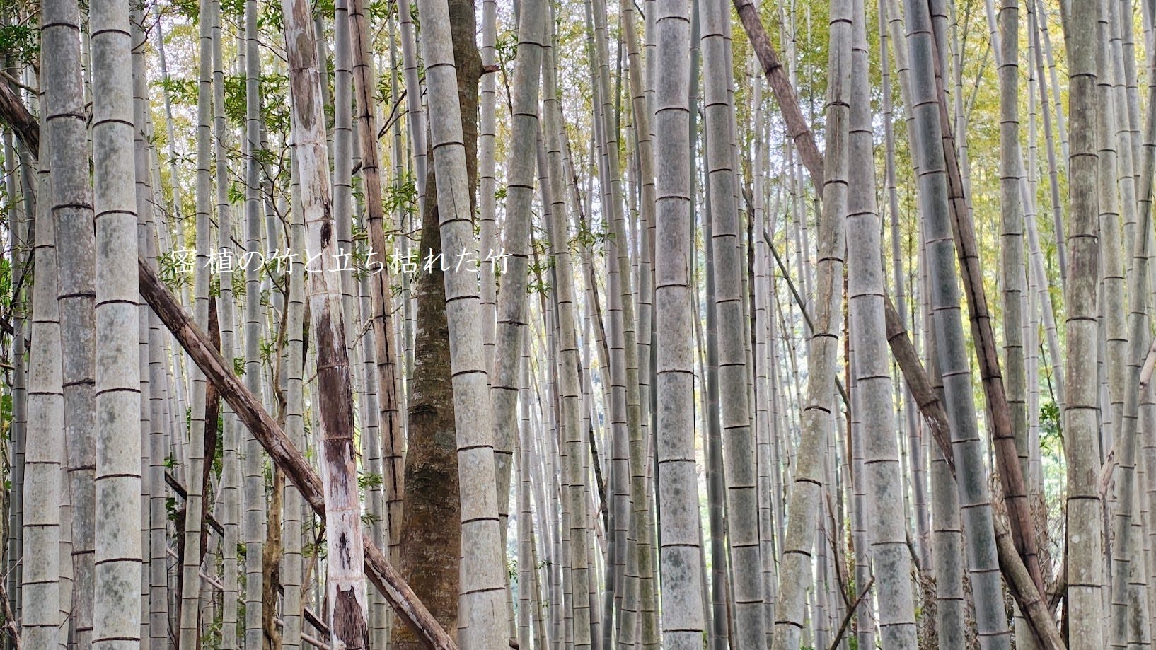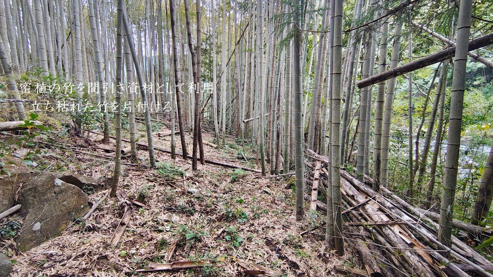 密集した竹や立ち枯れた竹が引っかかり倒れません・・・。