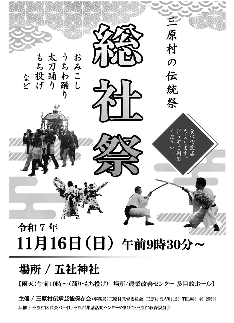 総社祭とは、村内の五社神社・諏訪神社・八坂神社による秋祭りのことで、