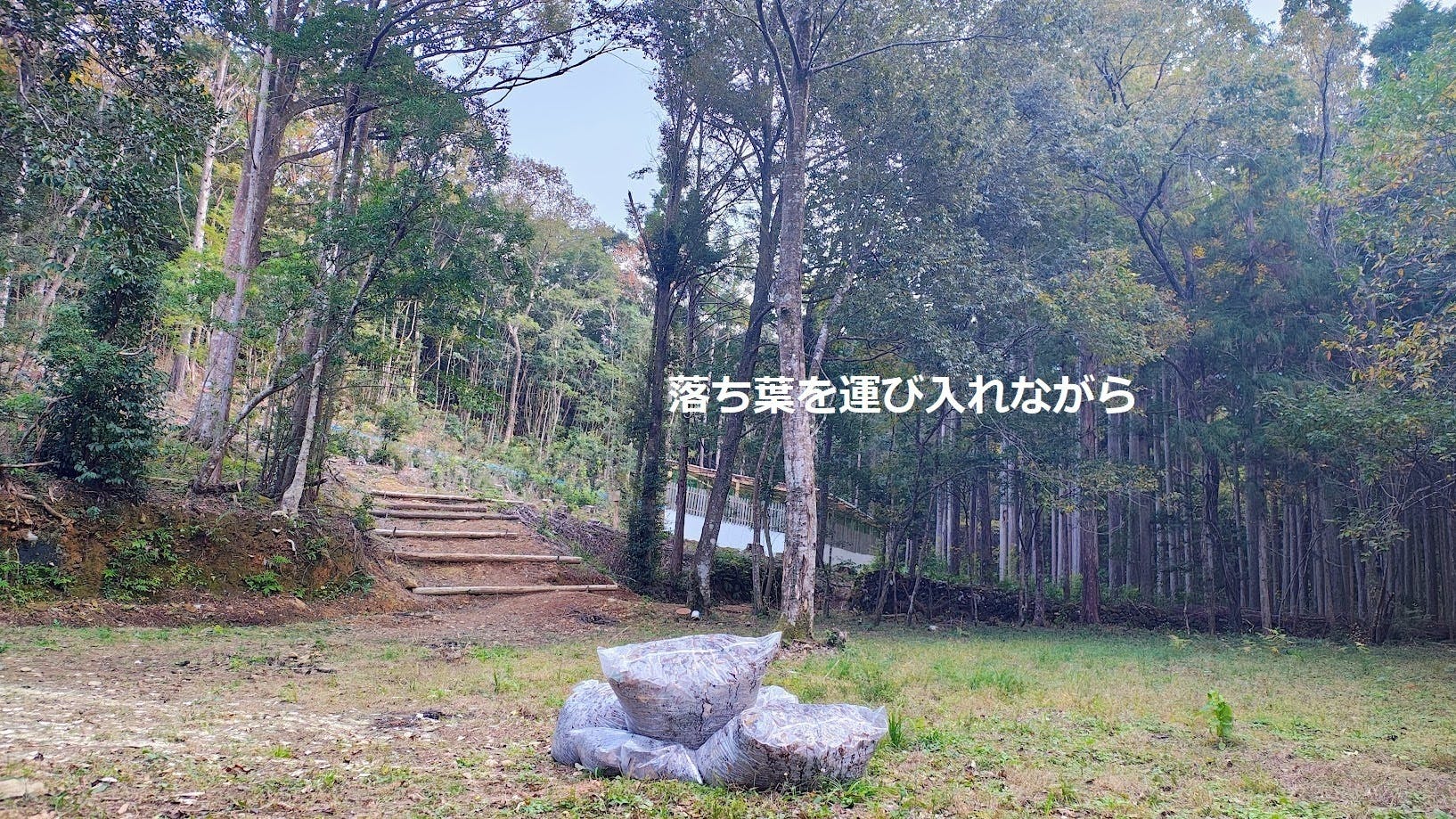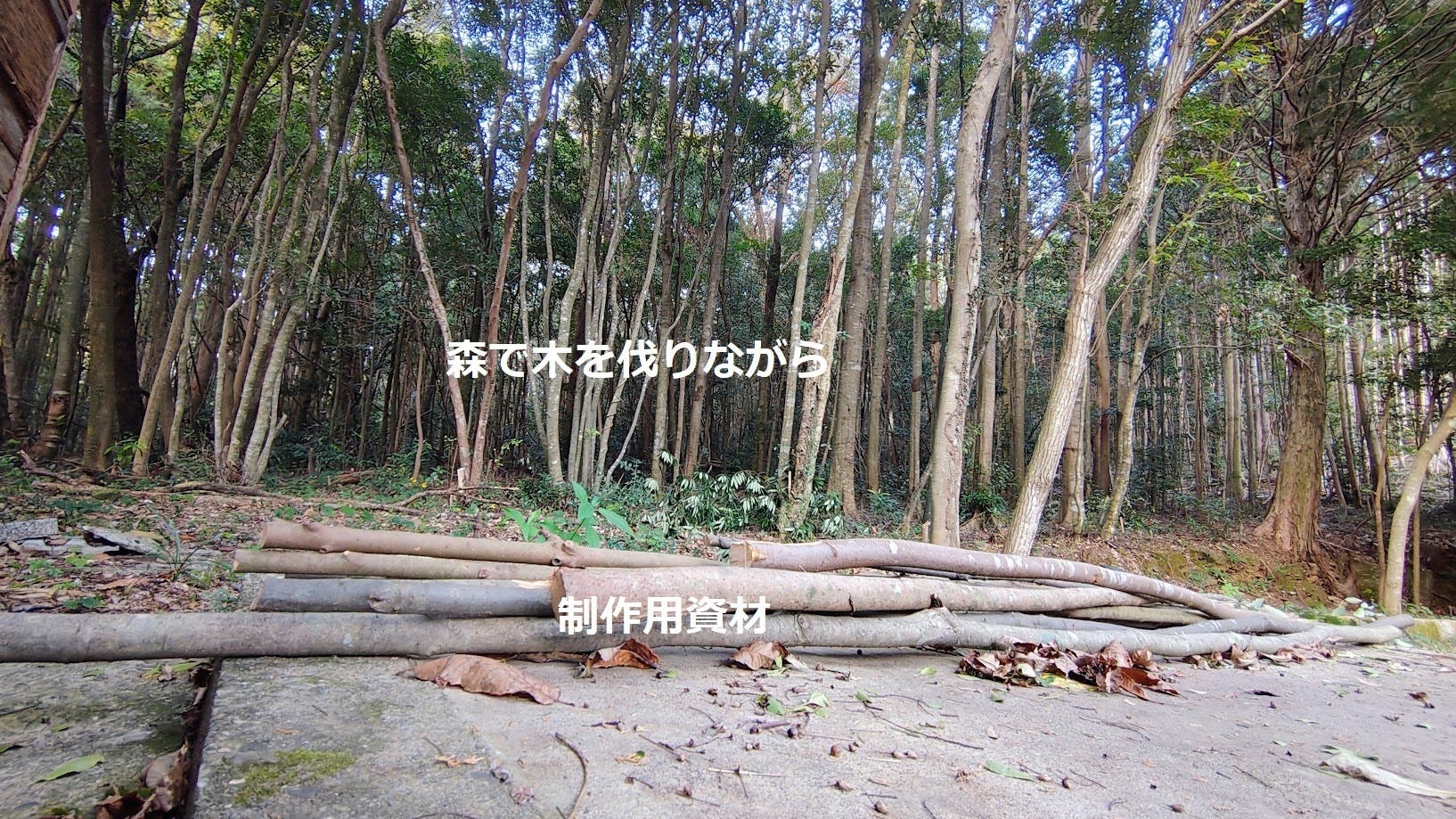 落ち葉を運び入れたり、森で資材になりそうな木を伐ってます。