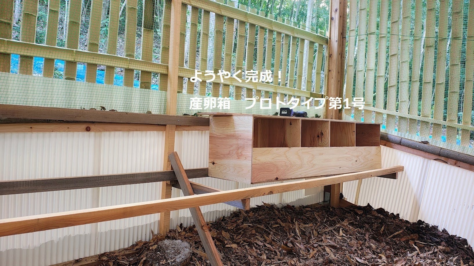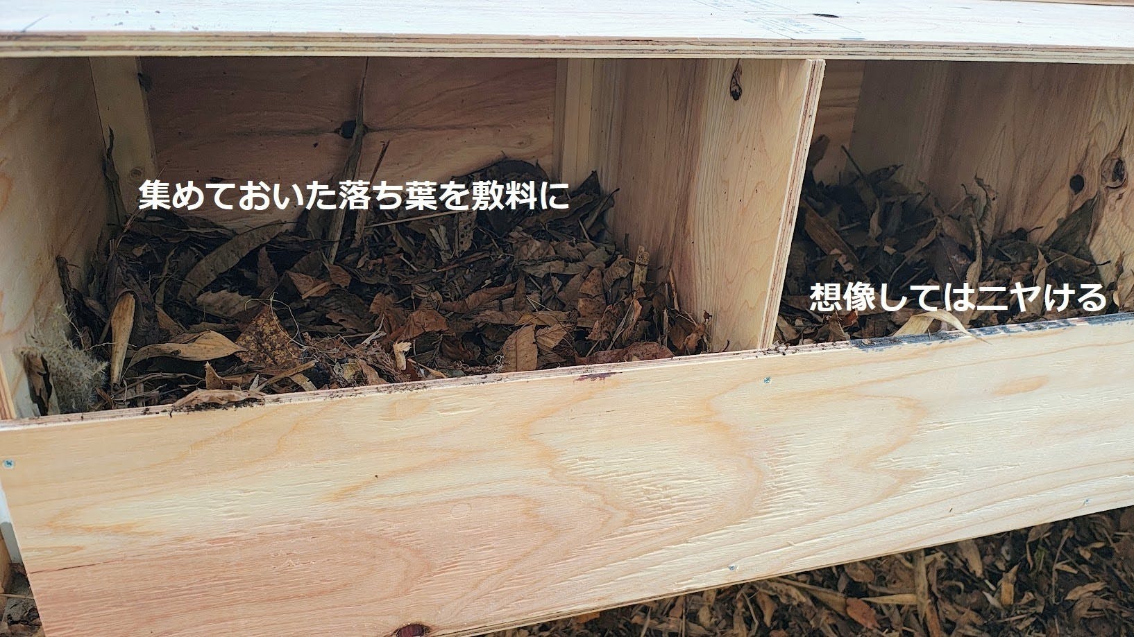 完成した産卵箱に落ち葉の敷料を入れ眺めては