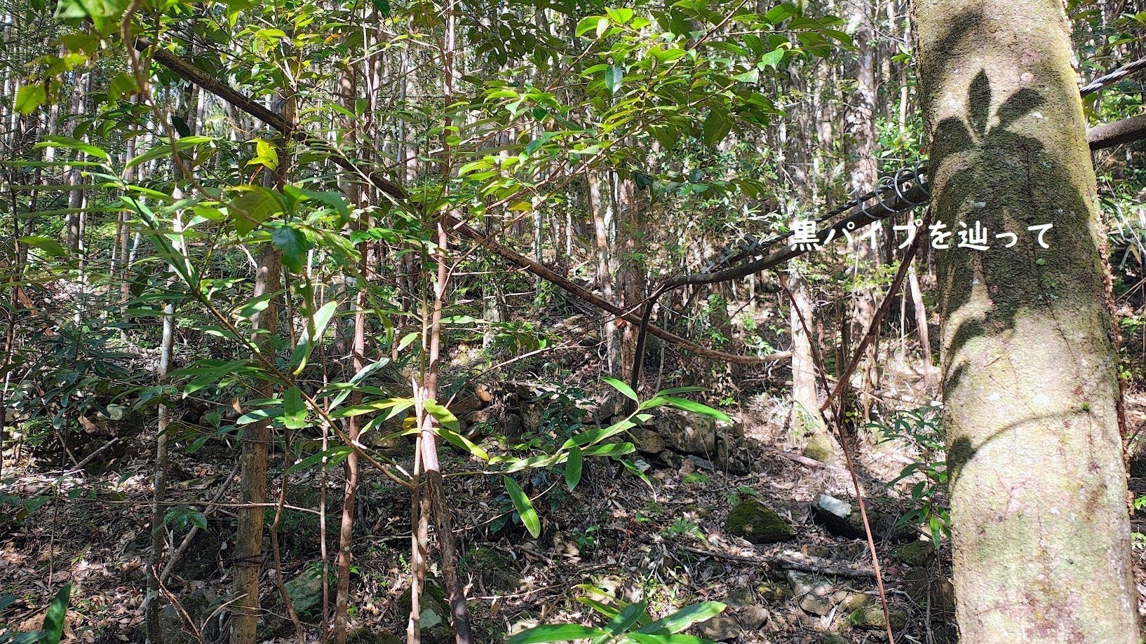 川を渡ってから、黒パイプを辿って谷あいを登っていきます。