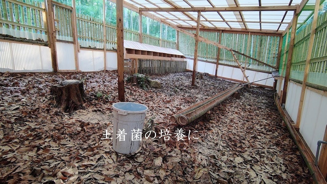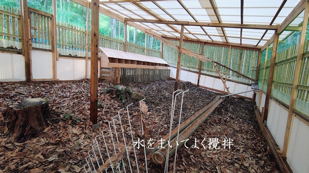 舎内に集め続けている落ち葉と竹林から持ち帰った土着菌に