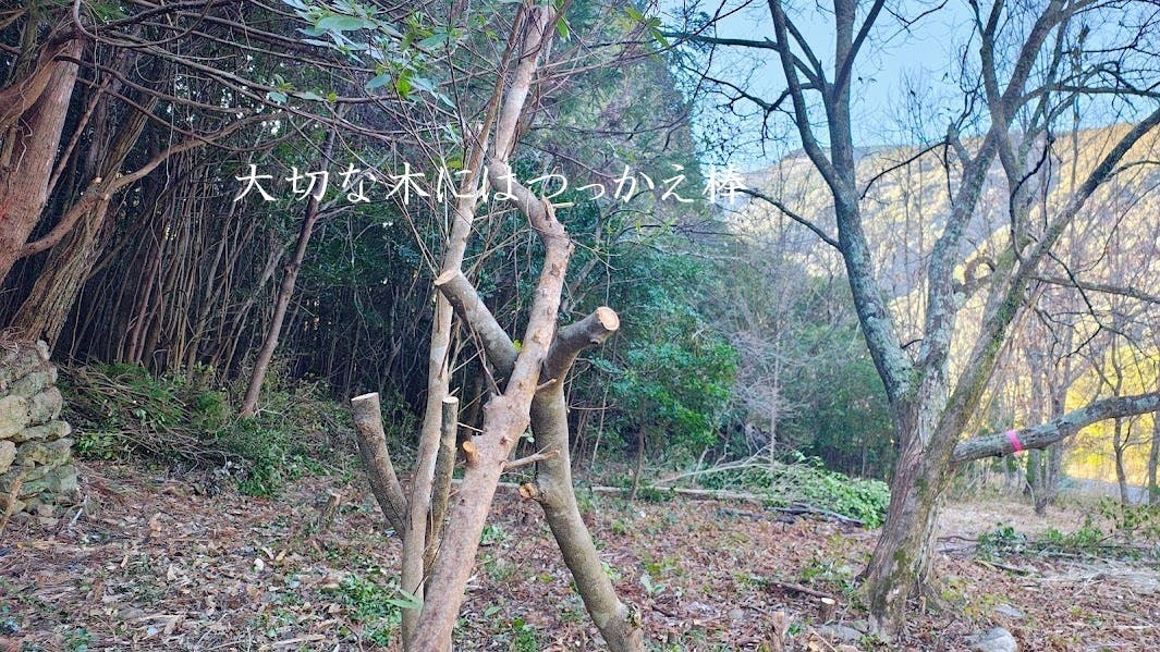 つっかえ棒で支えて木を起こします。