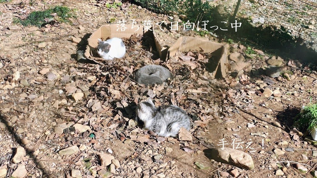落ち葉の上であったかそうに日向ぼっこ中 (苦笑)