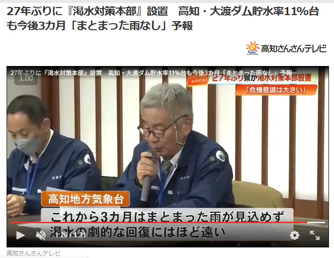 今、高知県ではまとまった雨が降らず、