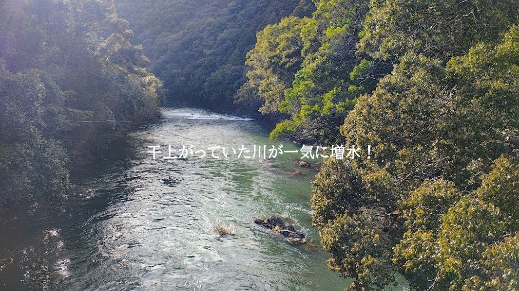 目の前の干上がっていた川が、一気に増水しています。