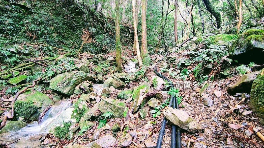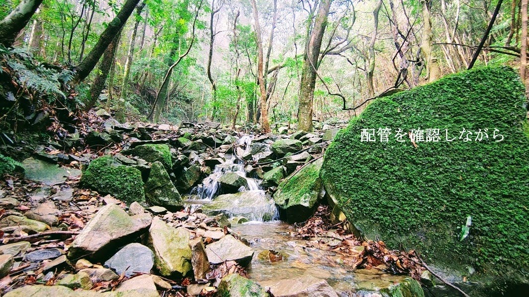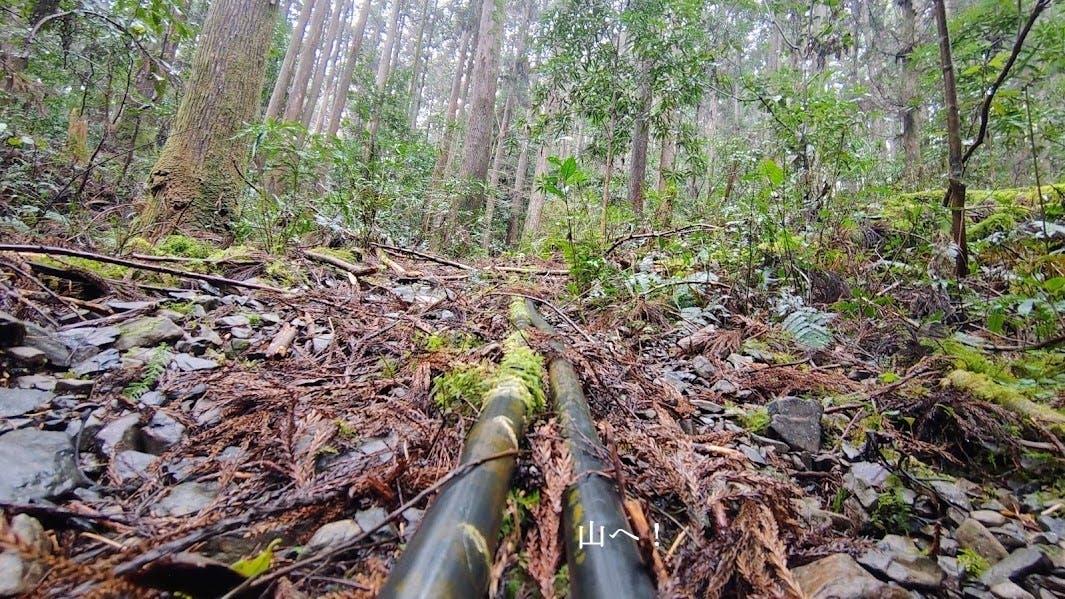配管の無事を確認しつつ、橋を渡り、いざ山へと登ります。