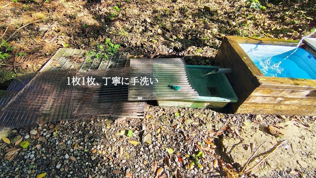 まずは、くすんでいたトタンを水場で1枚1枚、丁寧に手洗い。
