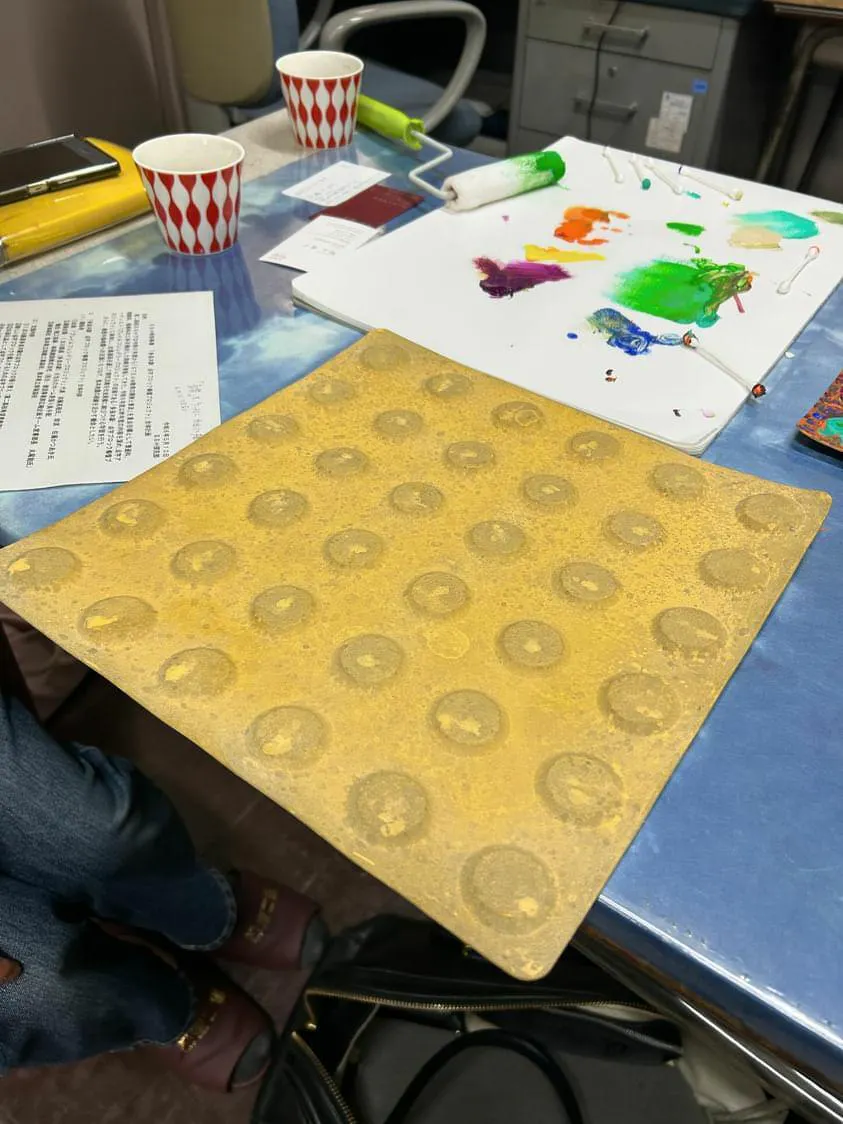 BRIDGE KUMAMOTOのお二人にも参加していただき、持参したサンプル(実物の点字ブロック)に色を付けてみて、どんな感じになるのかチェック。