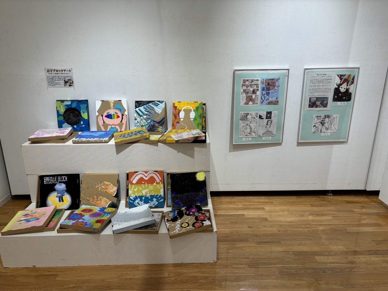 多良木駅から撤去してきた点字ブロックに絵を描いた作品が多数展示されています。本来なら処分されるはずの点字ブロックが、まさか美術館で展示されるなんて!