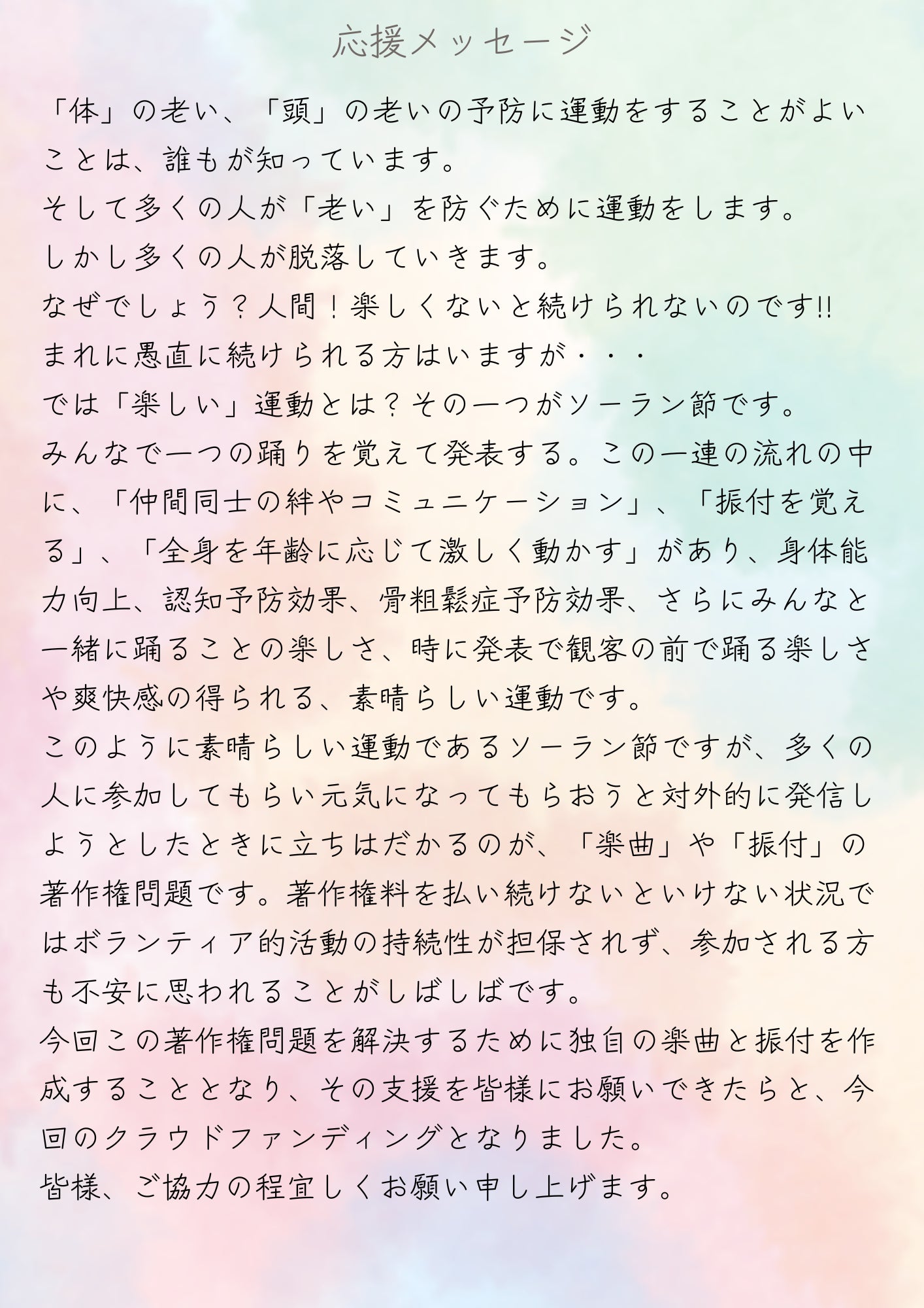 2026/01/01 12:00歩いていこうMV 転倒予防啓発ソングMV完成のご報告と、ここまでの歩みこのたび、クラウドファンディングで皆さまにご支援いただいた「転倒予防啓発ソング&ダンス」のミュージックビデオが、ついに完成しました。https://youtu.be/QJDhgxs5kXAまずは、あらためて心より感謝申し上げます。皆さま一人ひとりの応援がなければ、この作品は決して形になることはありませんでした。 【クラウドファンディングを始めるまでの想い】私がこのプロジェクトを立ち上げた背景には、個人的な経験があります。私は、母と祖母を、転倒・転落をきっかけに亡くしています。転倒は「たまたま起きた事故」として捉えられがちですが、その一度の転倒が、その後の生活や人生、命にまで大きく影響してしまうことを、家族として身をもって経験しました。また、地域で運動指導やダンス活動、転倒予防の取り組みを続ける中で、転倒をきっかけに外出を控えるようになった方や、「もう自信がない」と身体を動かさなくなってしまった方を数多く見てきました。転倒は、年齢を重ねれば誰にでも起こり得る。けれど、正しい知識と日々の意識で、防げる可能性が高い。その事実を、「注意喚起」や「怖さ」だけで伝えるのではなく、前向きで、楽しく、自然に続けられる形で届けたい。その想いが、クラウドファンディングを始める大きな原動力となりました。 なぜ「転倒予防ソング&ダンス」なのか運動が大切だと分かっていても、・きつい・続かない・正しくできているか分からないといった理由で、習慣化できない方は少なくありません。そこで着目したのが、口ずさめる音楽 × ダンスです。音楽に合わせて体を動かすことで、バランス力、下肢筋力、リズム感、認知機能など、転倒予防に必要な要素を無理なく刺激することができます。さらに今回の楽曲は、歌詞そのものが、転倒予防のヒントになるように作られています。日常生活の中で意識してほしいポイントを、専門的な言葉ではなく、誰にでも分かる言葉で歌詞に込めました。 楽曲とダンスに込めた意味・特徴今回完成した楽曲とダンスには、次のような想いと工夫があります。* 誰でも参加できる動き。でもちょっとむずかしい。 年齢や体力レベルを問わず、その人なりの動きで取り組める構成、しかしちょっと難しい振りも入れ、脳の認知機能を上げるコグニサイズの要素も。* 日常動作につながる振り付け 歩く、踏ん張る(バランス)、方向転換するなど、転倒予防に必要な動きを自然に取り入れています。* 歌いながら学べる構成 歌詞を口ずさむこと自体が、転倒予防の意識づけにつながるよう工夫しました。* 人と人をつなぐダンス 一人でも、仲間とでも楽しめることを大切にしています。このMVは、作品として「観る」だけでなく、実際に使われ、歌われ、踊られ、続いていく転倒予防ツールであってほしいと願っています。 これからについて完成はゴールではなく、ここからがスタートです。今後は地域活動やイベント、教室などを通じて、この楽曲とダンスを多くの方に届け、日常生活の中で自然に転倒予防を意識できるきっかけとして活用していただきたいと考えています。あらためて、このプロジェクトに関わってくださったすべての皆さまへ、心より感謝申し上げます。本当にありがとうございました。そしてこれからも、「楽しく続けられる転倒予防」を合言葉に、取り組んでまいります。柏健康ソーラン倶楽部 藤﨑 成吾 もっと見る