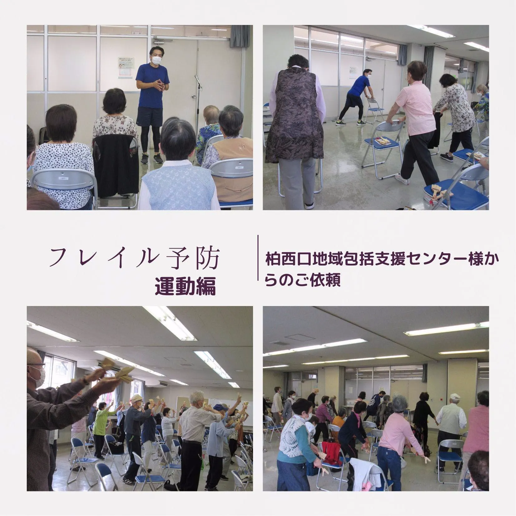 コロナ禍でありながら、柏西口地域包括支援センター様からのご依頼で、フレイル予防の運動編の講師として指導。