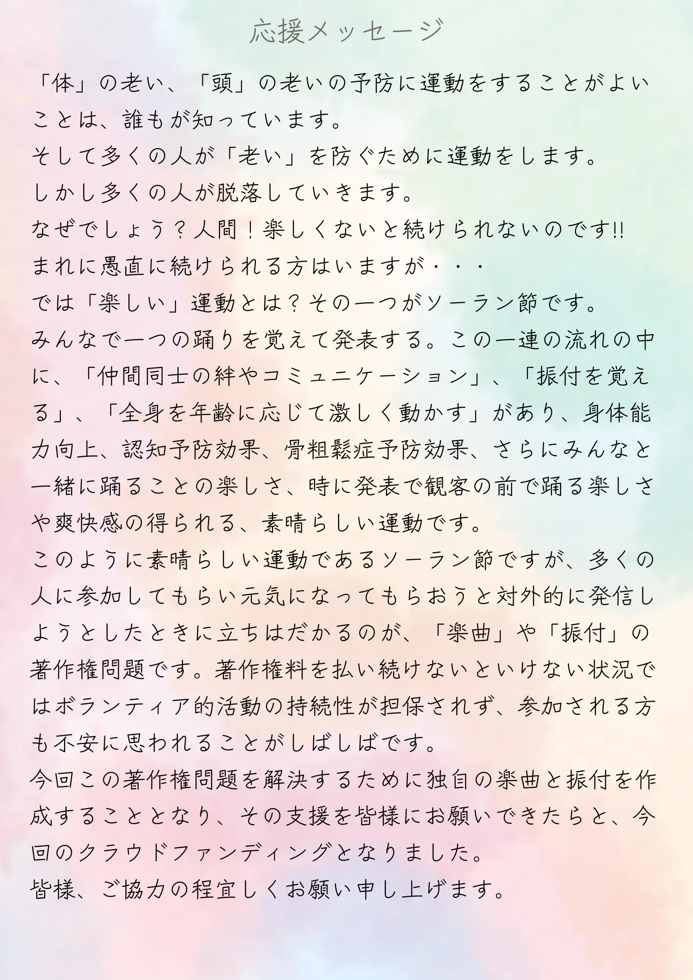 2026/01/01 12:00歩いていこうMV 転倒予防啓発ソングMV完成のご報告と、ここまでの歩みこのたび、クラウドファンディングで皆さまにご支援いただいた「転倒予防啓発ソング&ダンス」のミュージックビデオが、ついに完成しました。https://youtu.be/QJDhgxs5kXAまずは、あらためて心より感謝申し上げます。皆さま一人ひとりの応援がなければ、この作品は決して形になることはありませんでした。 【クラウドファンディングを始めるまでの想い】私がこのプロジェクトを立ち上げた背景には、個人的な経験があります。私は、母と祖母を、転倒・転落をきっかけに亡くしています。転倒は「たまたま起きた事故」として捉えられがちですが、その一度の転倒が、その後の生活や人生、命にまで大きく影響してしまうことを、家族として身をもって経験しました。また、地域で運動指導やダンス活動、転倒予防の取り組みを続ける中で、転倒をきっかけに外出を控えるようになった方や、「もう自信がない」と身体を動かさなくなってしまった方を数多く見てきました。転倒は、年齢を重ねれば誰にでも起こり得る。けれど、正しい知識と日々の意識で、防げる可能性が高い。その事実を、「注意喚起」や「怖さ」だけで伝えるのではなく、前向きで、楽しく、自然に続けられる形で届けたい。その想いが、クラウドファンディングを始める大きな原動力となりました。 なぜ「転倒予防ソング&ダンス」なのか運動が大切だと分かっていても、・きつい・続かない・正しくできているか分からないといった理由で、習慣化できない方は少なくありません。そこで着目したのが、口ずさめる音楽 × ダンスです。音楽に合わせて体を動かすことで、バランス力、下肢筋力、リズム感、認知機能など、転倒予防に必要な要素を無理なく刺激することができます。さらに今回の楽曲は、歌詞そのものが、転倒予防のヒントになるように作られています。日常生活の中で意識してほしいポイントを、専門的な言葉ではなく、誰にでも分かる言葉で歌詞に込めました。 楽曲とダンスに込めた意味・特徴今回完成した楽曲とダンスには、次のような想いと工夫があります。* 誰でも参加できる動き。でもちょっとむずかしい。 年齢や体力レベルを問わず、その人なりの動きで取り組める構成、しかしちょっと難しい振りも入れ、脳の認知機能を上げるコグニサイズの要素も。* 日常動作につながる振り付け 歩く、踏ん張る(バランス)、方向転換するなど、転倒予防に必要な動きを自然に取り入れています。* 歌いながら学べる構成 歌詞を口ずさむこと自体が、転倒予防の意識づけにつながるよう工夫しました。* 人と人をつなぐダンス 一人でも、仲間とでも楽しめることを大切にしています。このMVは、作品として「観る」だけでなく、実際に使われ、歌われ、踊られ、続いていく転倒予防ツールであってほしいと願っています。 これからについて完成はゴールではなく、ここからがスタートです。今後は地域活動やイベント、教室などを通じて、この楽曲とダンスを多くの方に届け、日常生活の中で自然に転倒予防を意識できるきっかけとして活用していただきたいと考えています。あらためて、このプロジェクトに関わってくださったすべての皆さまへ、心より感謝申し上げます。本当にありがとうございました。そしてこれからも、「楽しく続けられる転倒予防」を合言葉に、取り組んでまいります。柏健康ソーラン倶楽部 藤﨑 成吾 もっと見る
