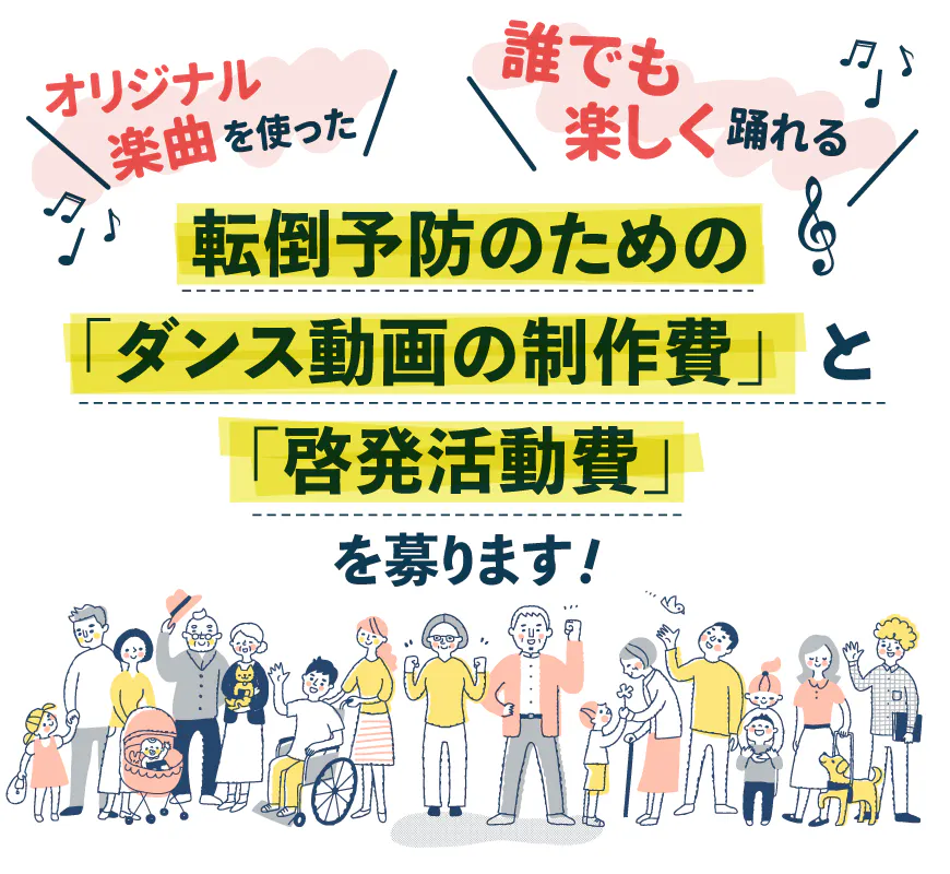 ダンス動画は、クラウドファンディングに参加して頂いた皆様と共に作成します!お子様からご年配の方まで幅広い年代の方でも踊れる、認知症予防にも効果的な「体と頭を一緒に使ったダンス」