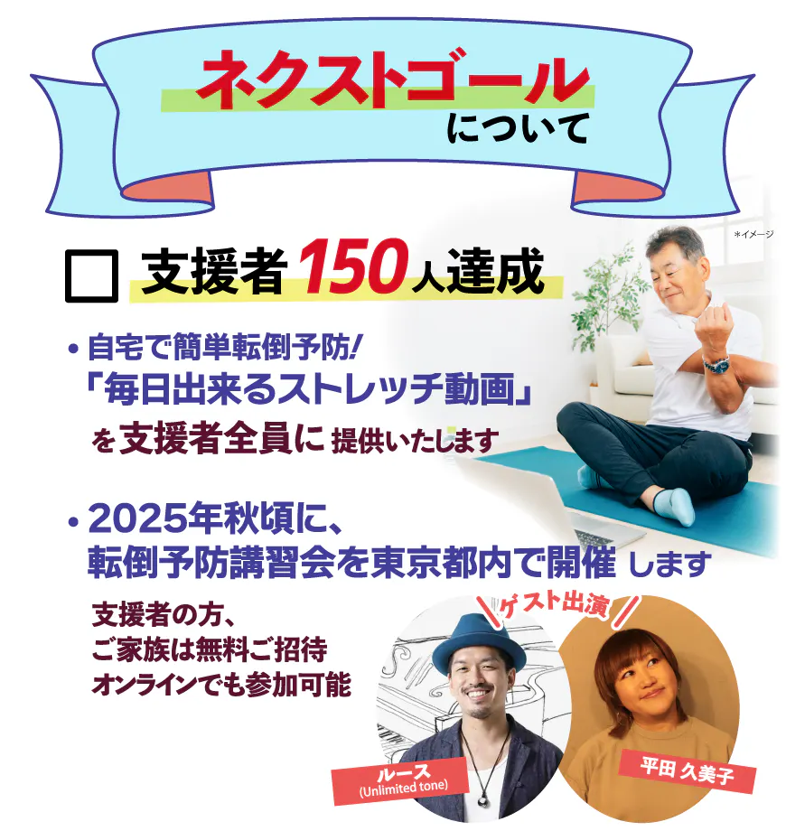 このプロジェクトを通じて、多くの方が「転倒死を減らしたい!」という想いを共にしてくださったことに、心から感謝申し上げます。プロジェクト拡散のため、新たな目標を設定いたしました!