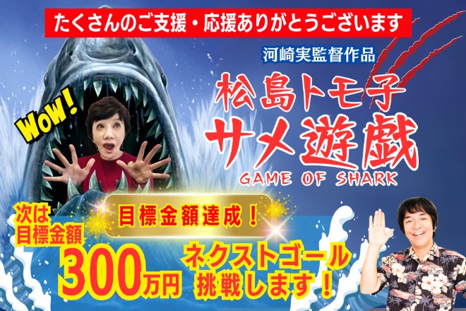 ボードゲーム「サメポリー」のショートムービーでキャストに松島トモ子さんが決まってから、あれよあれよと、これをふくらませた形の劇場映画の企画となり、製作配給が決まりました! これも松島さんの、ライオンとヒョウに襲われながらも生還した強運(悪運?)の賜物と思っています。いままで撮らなかった「サメ映画」の一大ジャンルに殴り込みをかけるべく張り切っています。タイトルは「ブルースリー 死亡遊戯」にならっての『松島トモ子 サメ遊戯』!! あっと驚くキャストにもご期待!どうぞご支援のほどよろしくお願いいたします!!