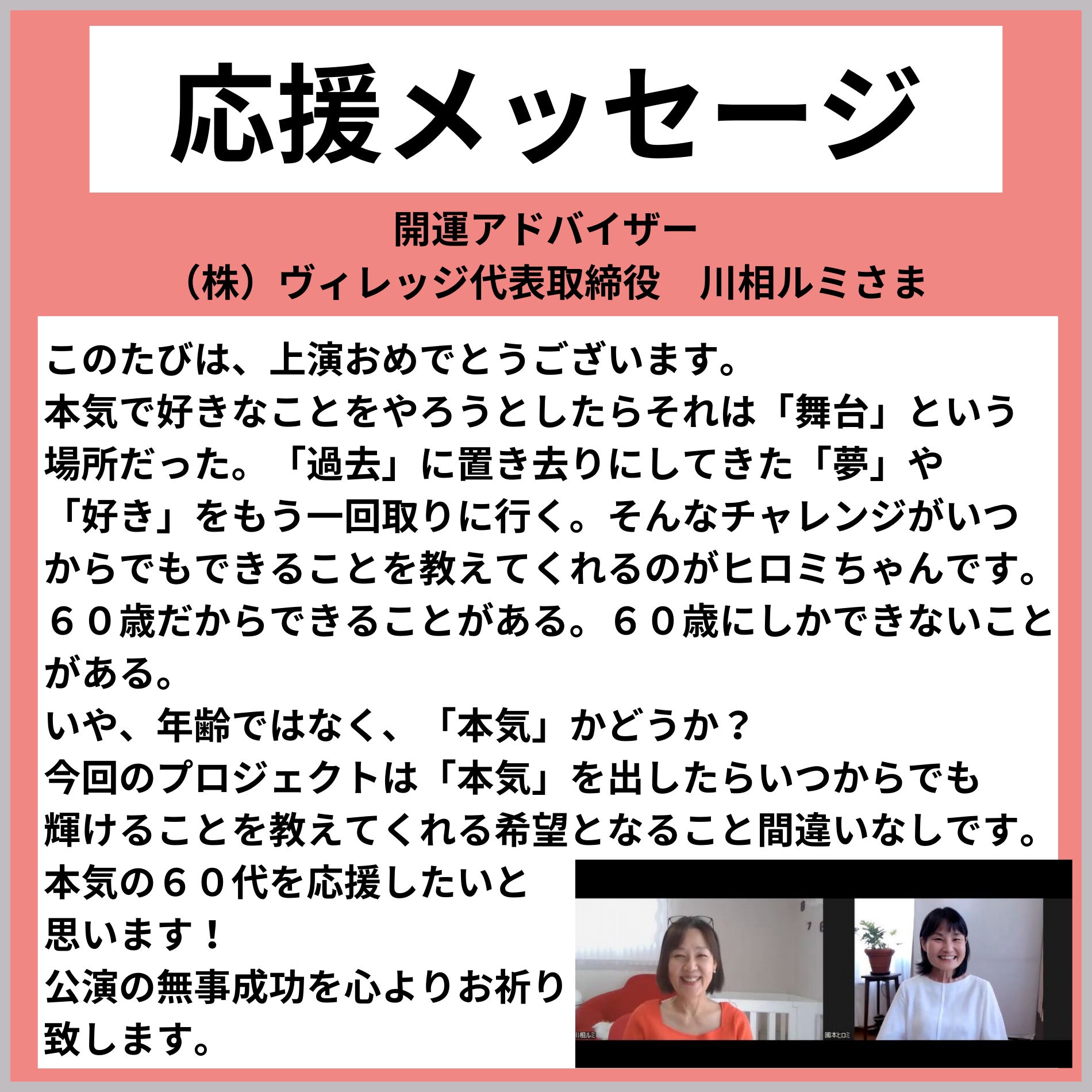 この『舞台』が演じる者、観る者すべてにとって、何かが変わるきっかけになればと願います。